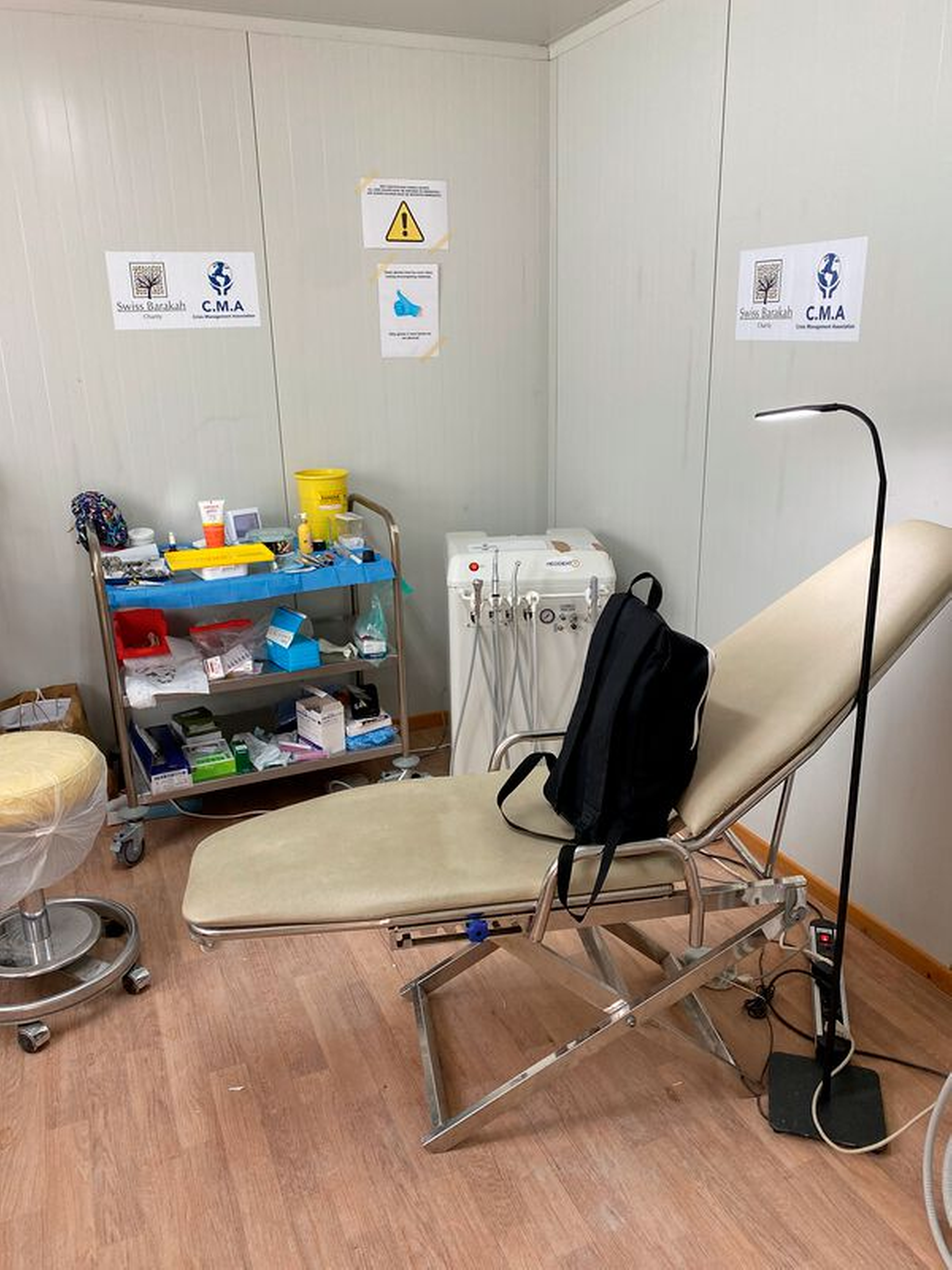 Die „Zahnklinik“ ist in einem Container untergebracht, der aus zwei kleinen Räumen besteht. Fließendes Wasser gibt es nicht, dafür ein umfangreiches, wenn auch leider unsortiertes Sortiment an Materialien und Instrumentarien – mit einem deutschen Sterilisationsgerät als echtem Lichtblick. Dazu gibt es zwei Klappstühle und Behandlungsmotoren, die zusammen mit dem Kompressor in einer Art Koffer untergebracht sind und bei der Benutzung einen ohrenbetäubenden Lärm verursachen.