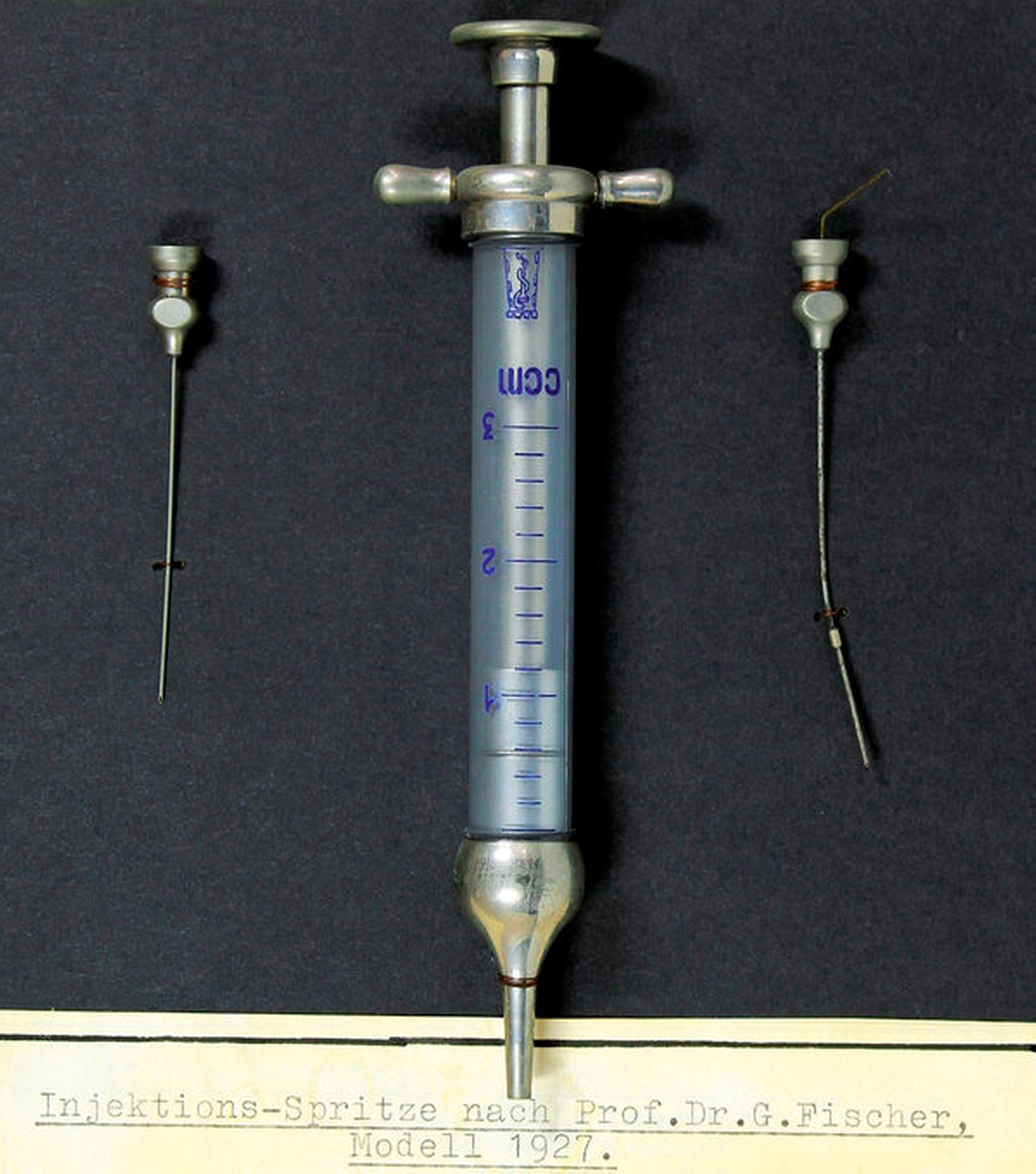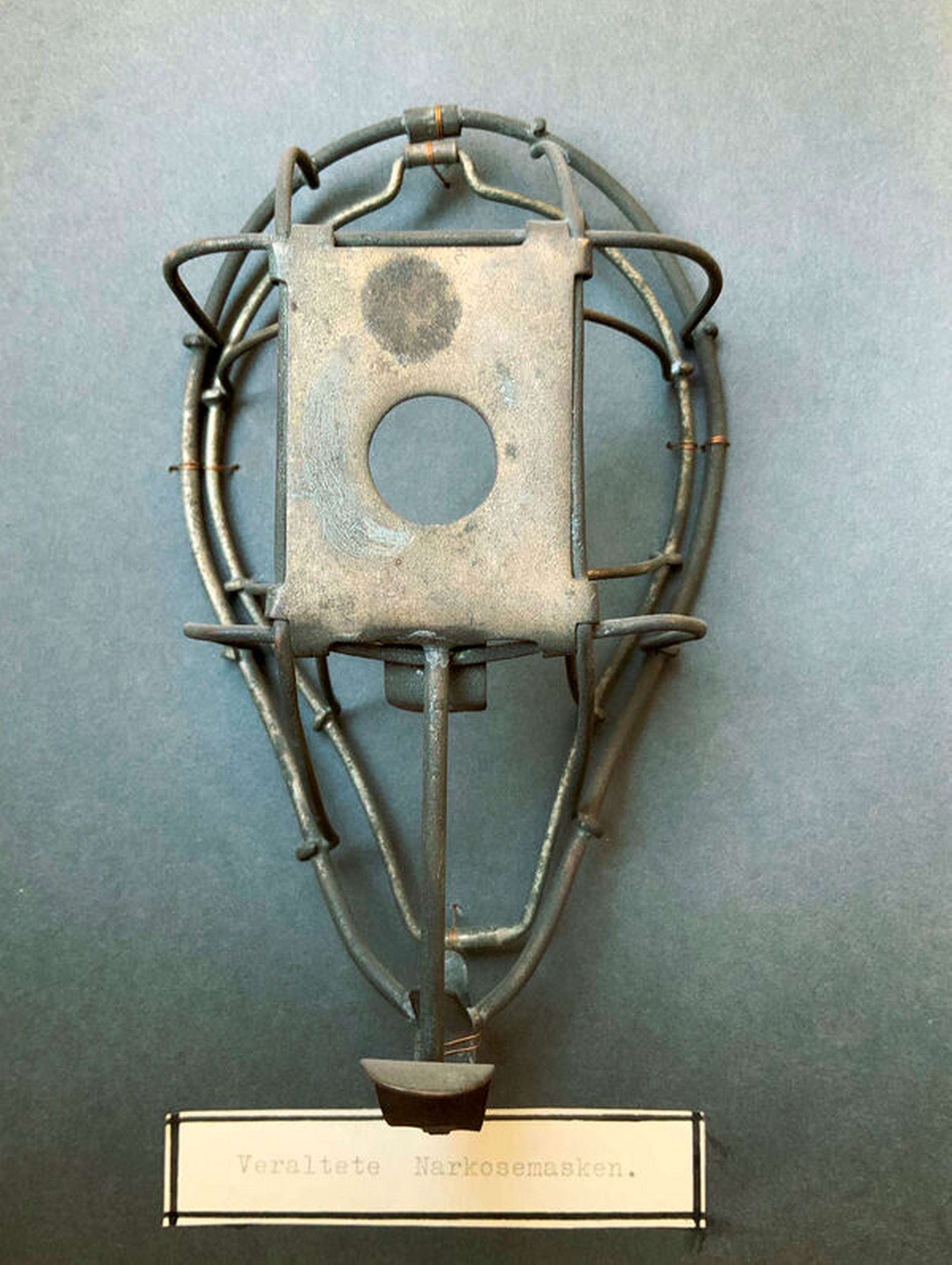 Entdeckt wurde bei Aufräumungsarbeiten im alten Institutsgebäude allerdings eine Rarität: ein Unterrichtsfilm, in dem der vormalige Institutsdirektor Prof Dr. Guido Fischer (von 1911 bis 1919) seine Technik der Lokal- und Leitungsanästhesie erläutert. Fischer war ein Wegbereiter der Lokalanästhesie [Groß, 2018], und der Film aus dem Jahr 1914 gehört zu den ersten zahnärztlichen Lehrfilmen – er wurde restauriert und bei Fortbildungen gezeigt. In der Sammlung wird auch eine Injektionsspitze gezeigt, die Fischer 1914 entwickelte, samt alter Narkosemaske.