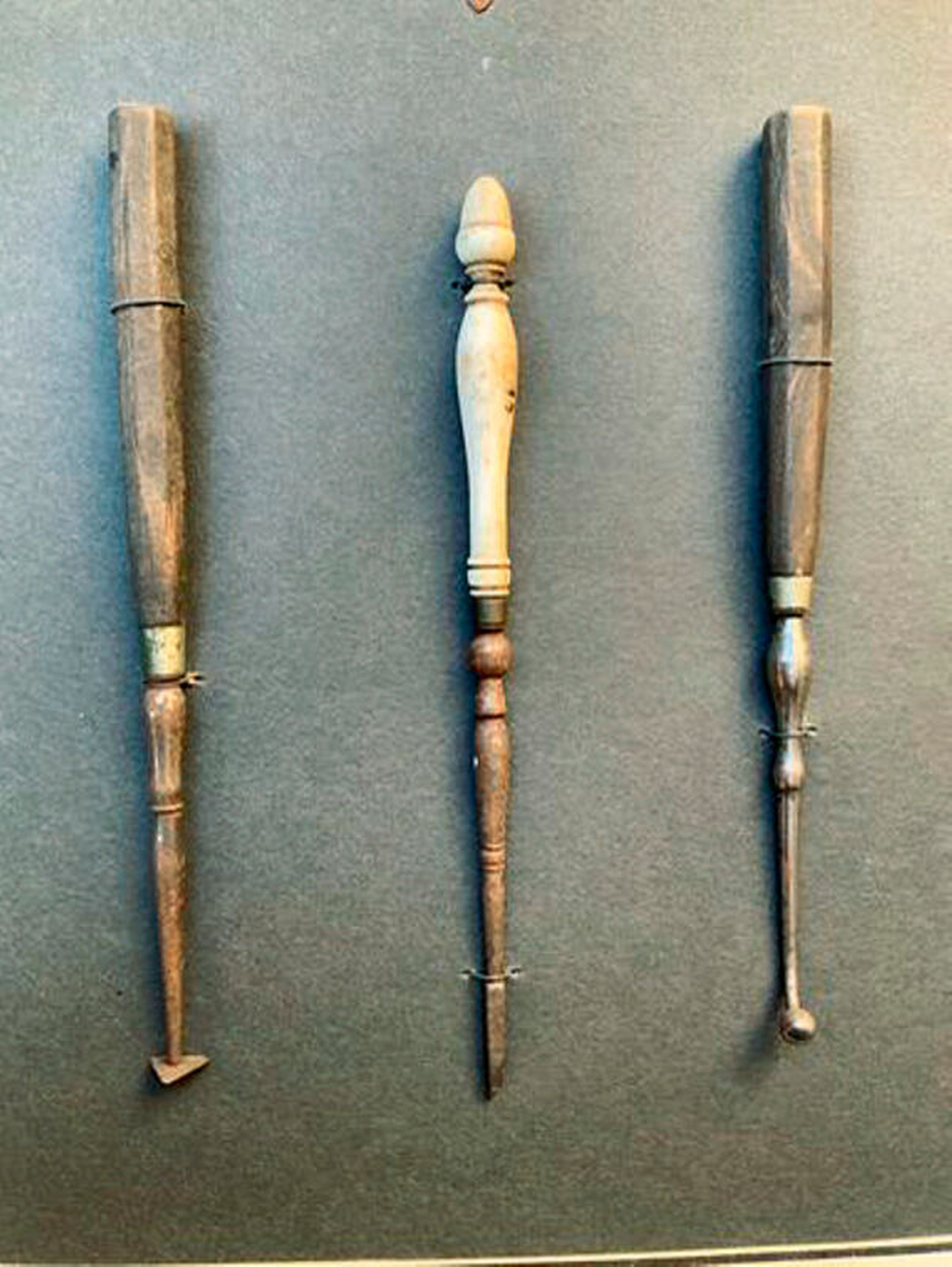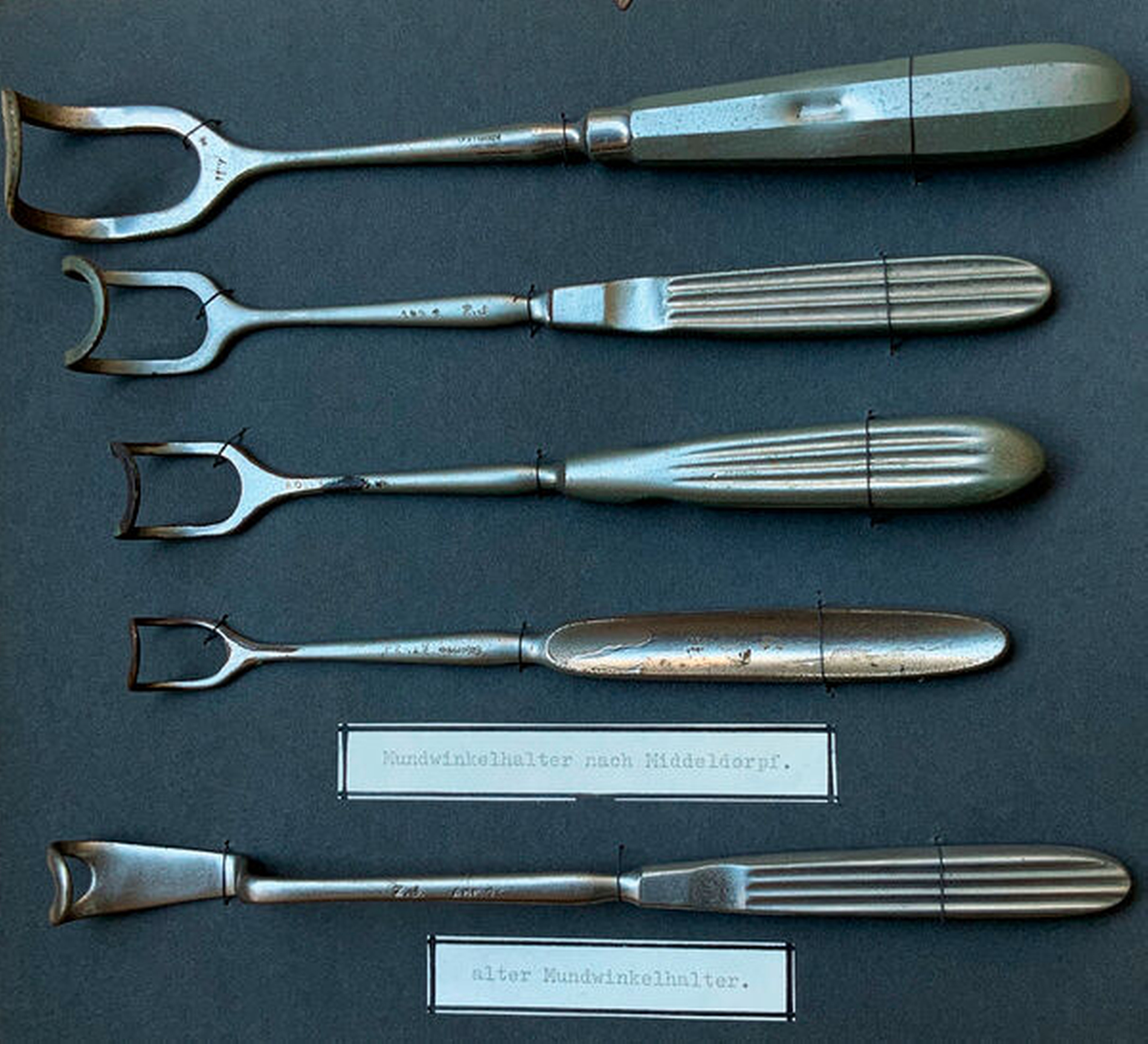 Zu den gezeigten chirurgischen Instrumenten gehören unter anderem Mundwinkel- und Wangenhalter, Wundhaken, Wurzelschrauben und Winkelstücke sowie zehn verschiedene Zahnzangen. Besonderheiten sind eine Front- und eine Molarenzange im Rohrguss. Darüber hinaus gibt es eine Kollektion von Zahnreinigungsinstrumenten, Geräte zur Zahnmassage, Zahnstocher, auch ein Exemplar des Interdentalreinigers „Fedenor“ ist ausgestellt.