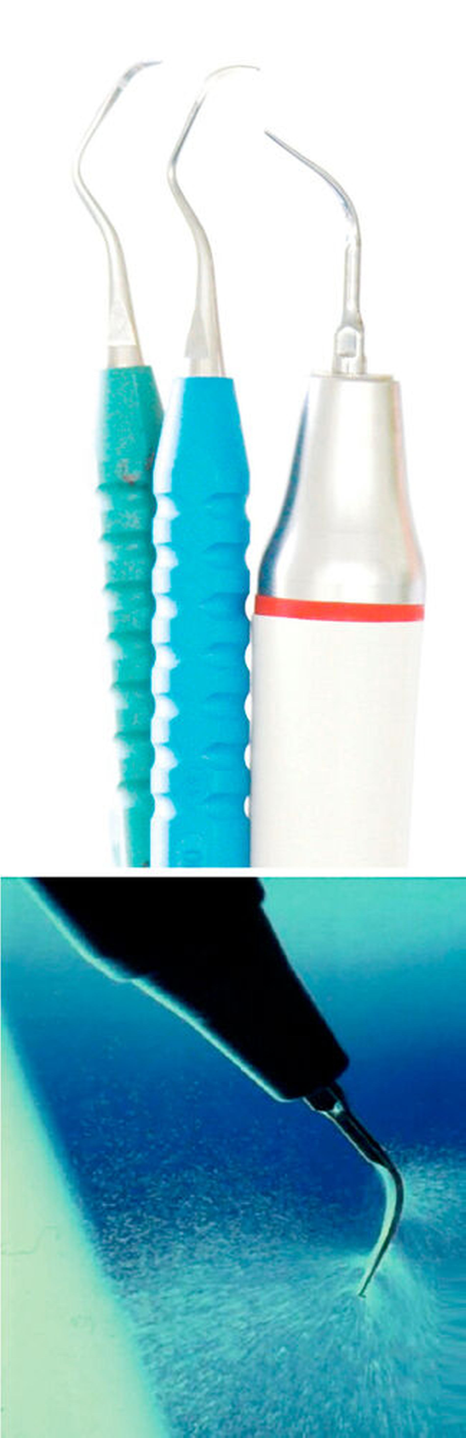 Die zweite Therapiestufe (auch als ursachengerichtete Therapie bekannt) zielt auf die Beseitigung (Reduktion) von subgingivalem Biofilm sowie subgingivalem Zahnstein und kann mit der Entfernung von Anteilen der Wurzeloberfläche (Wurzelzement) einhergehen. Diese Intervention hat in der Literatur verschiedene Namen: subgingivales Debridement, subgingivales Scaling, Root Planing et cetera [Kieser, 1994]. In der Leitlinie wurde vereinbart, den Begriff „subgingivale Instrumentierung“ für alle nicht-chirurgischen Interventionen zu verwenden, die entweder mit Küretten oder mit maschinell betriebenen Instrumenten (Schall/Ultraschall) durchgeführt werden. Diese Instrumente wurden konzipiert, um den Zugang zur Wurzeloberfläche im subgingivalen Bereich zu erleichtern und um effektiv subgingivalen Biofilm und subgingivalen Zahnstein zu entfernen (Abbildung 1).