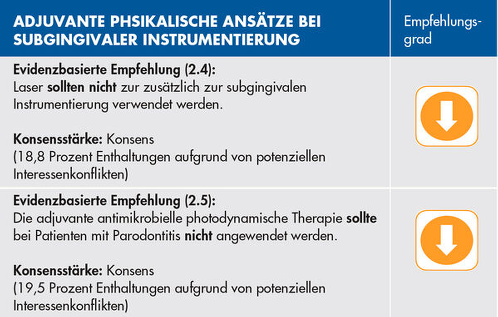In einer systematischen Übersichtsarbeit haben Salvi et al. [2020] zwei relevante Fragen zu adjuvanten physikalischen Ansätzen bei der subgingivalen Instrumentierung adressiert: