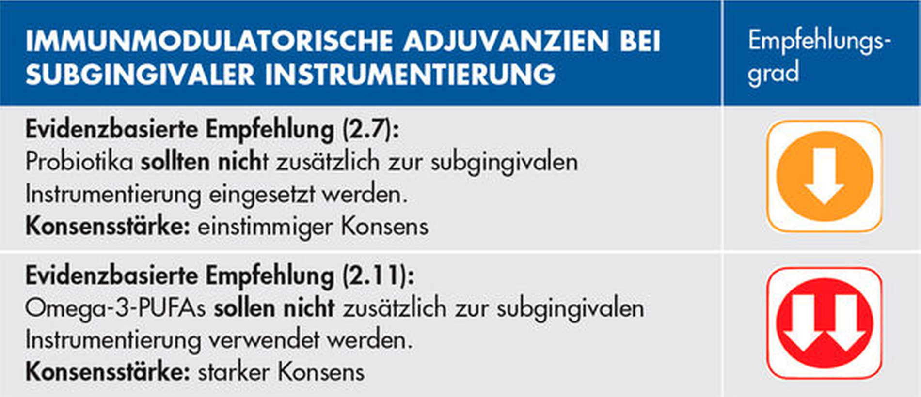 In einer systematischen Übersichtsarbeit haben Donos et al. [2020] Fragen zu lokalen beziehungsweise systemischen immunmodulatorischen Adjuvanzien bei der subgingivalen Instrumentierung adressiert. Da die meisten dieser Adjuvanzien in Deutschland nicht zugelassen sind, beschränkt sich diese Übersicht auf die aktuelle Bewertung von zwei potenziell interessanten Ansätzen: Probiotika und mehrfach ungesättigte Omega-3-Fettsäuren.