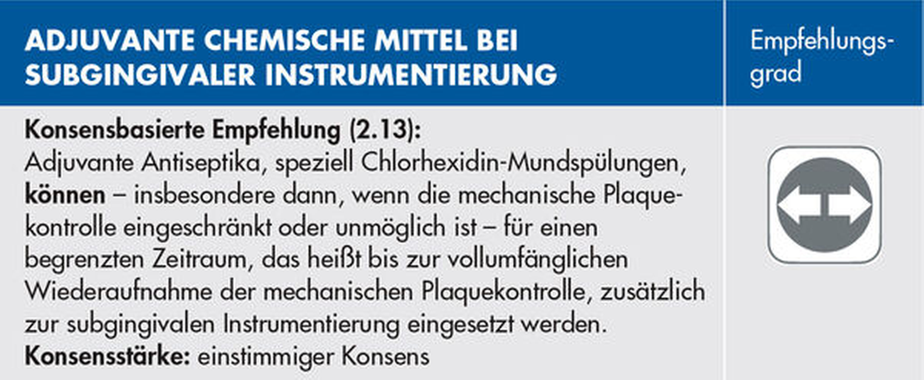 Um die gingivale Entzündung während der Parodontaltherapie unter Kontrolle zu halten, wurde der adjuvante Gebrauch von einigen Produkten vorgeschlagen. Chlorhexidin-Mundspülungen wurden in diesem Zusammenhang häufig getestet und werden häufig in verschiedenen klinischen Szenarien eingesetzt. In den systematischen Übersichtsarbeiten des European Workshops wurde die Rolle von Antiseptika in der aktiven Parodontaltherapie nicht direkt adressiert. Jedoch gibt es einige Hinweise zur Rolle von Chlorhexidin nach subgingivaler Instrumentierung [da Costa et al., 2017]. Es wurde deshalb eine konsensbasierte Empfehlung formuliert.
