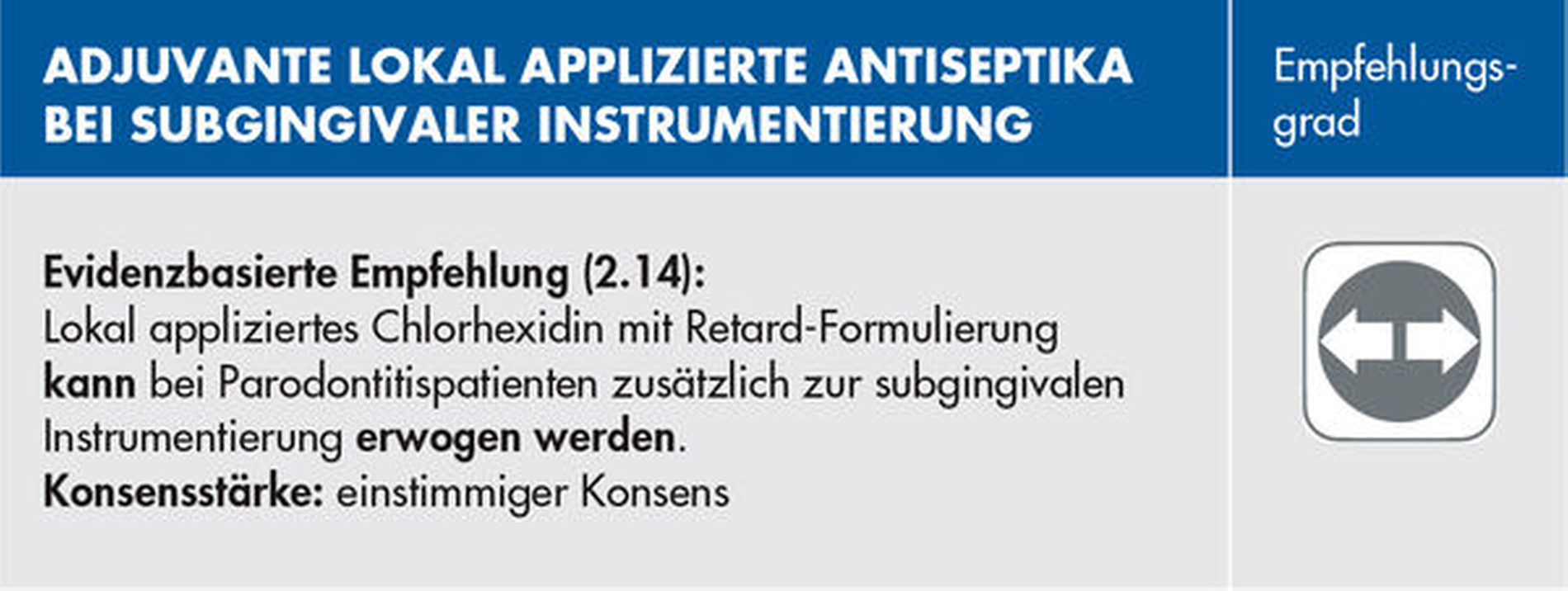 In einer systematischen Übersichtsarbeit haben Herrera et al. [2020] die Evidenz hinsichtlich des Nutzens von lokal applizierten Antiseptika mit Retard-Formulierung zusätzlich zur subgingivalen Instrumentierung aufgearbeitet. Sie betrachteten die Ergebnisse von Studien zu Chlorhexidin-Produkten. Dabei zeigte ein Produkt (PerioChip®) eine geringfügige, aber statistisch signifikant größere TST-Reduktion nach ein- oder mehrmaliger Applikation zusätzlich zur subgingivalen Instrumentierung. Es wurden keine signifikanten Unterschiede beim CAL-Gewinn beobachtet. Die Daten bezüglich BOP waren unzureichend und es wurden keine Angaben über Pocket Closure oder die Anzahl der benötigten Behandlungen gemacht. Eine geschätzte Effektgröße für alle TST-Kategorien zeigt eine zusätzliche TST-Reduktion um zehn Prozent. Die Kosten für das Produkt müssen berücksichtigt werden. Insgesamt existiert nicht genug Evidenz hinsichtlich des Nutzens von lokal applizierten Antiseptika mit Retard-Formulierung zusätzlich zur subgingivalen Instrumentierung bei Patienten mit Parodontitis.