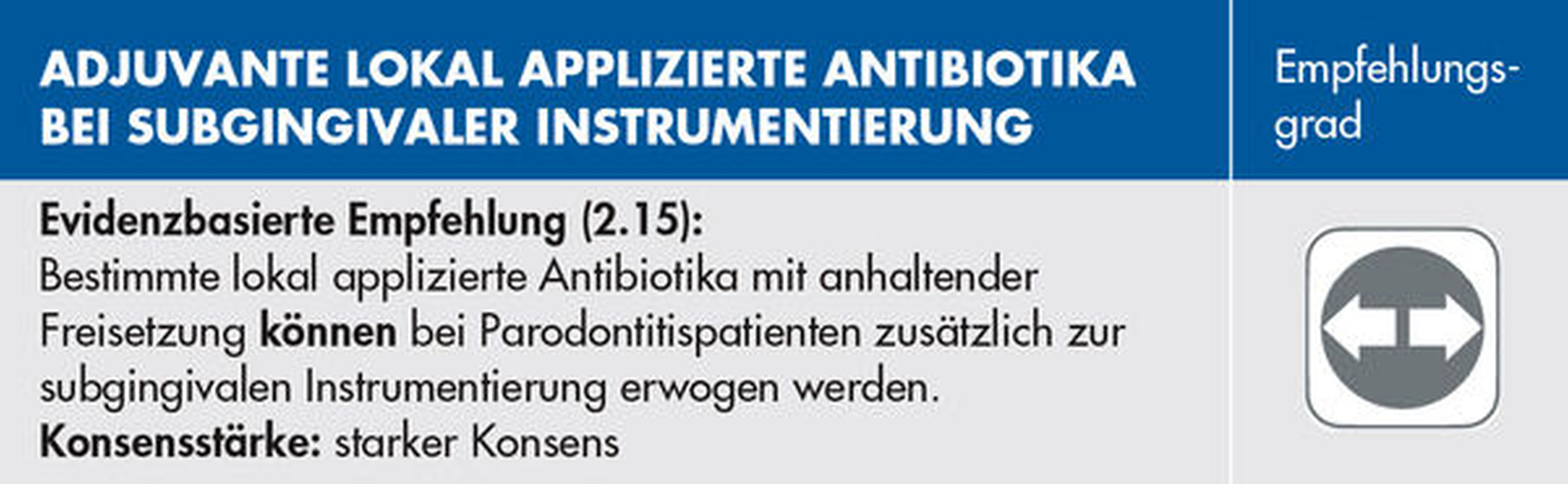 Das systematische Review von Herrera et al. [2020] zeigte für lokal applizierte Antibiotika, die auf dem europäischen Markt verfügbar sind, eine statistisch signifikant bessere TST-Reduktion von 0,3 bis 0,8 mm als Adjuvans zur subgingivalen Instrumentierung bei einem Follow-up von sechs bis neun Monaten. Statistisch signifikante Verbesserungen der CAL-Veränderung von 0,4 bis 0,5 mm wurden ebenfalls festgestellt. Es lagen keine Daten bezüglich BOP und Pocket Closure vor. Die geschätzte Effektgröße war um 10 bis 30 Prozent größer als bei ausschließlich mechanischer Instrumentierung bezüglich der TST-Reduktion. Nutzen-Risiko-Überlegungen bezüglich des Gebrauchs von Antibiotika müssen berücksichtigt werden. Die hohen Kosten und die limitierte Verfügbarkeit der Produkte in Deutschland müssen ebenfalls berücksichtigt werden.