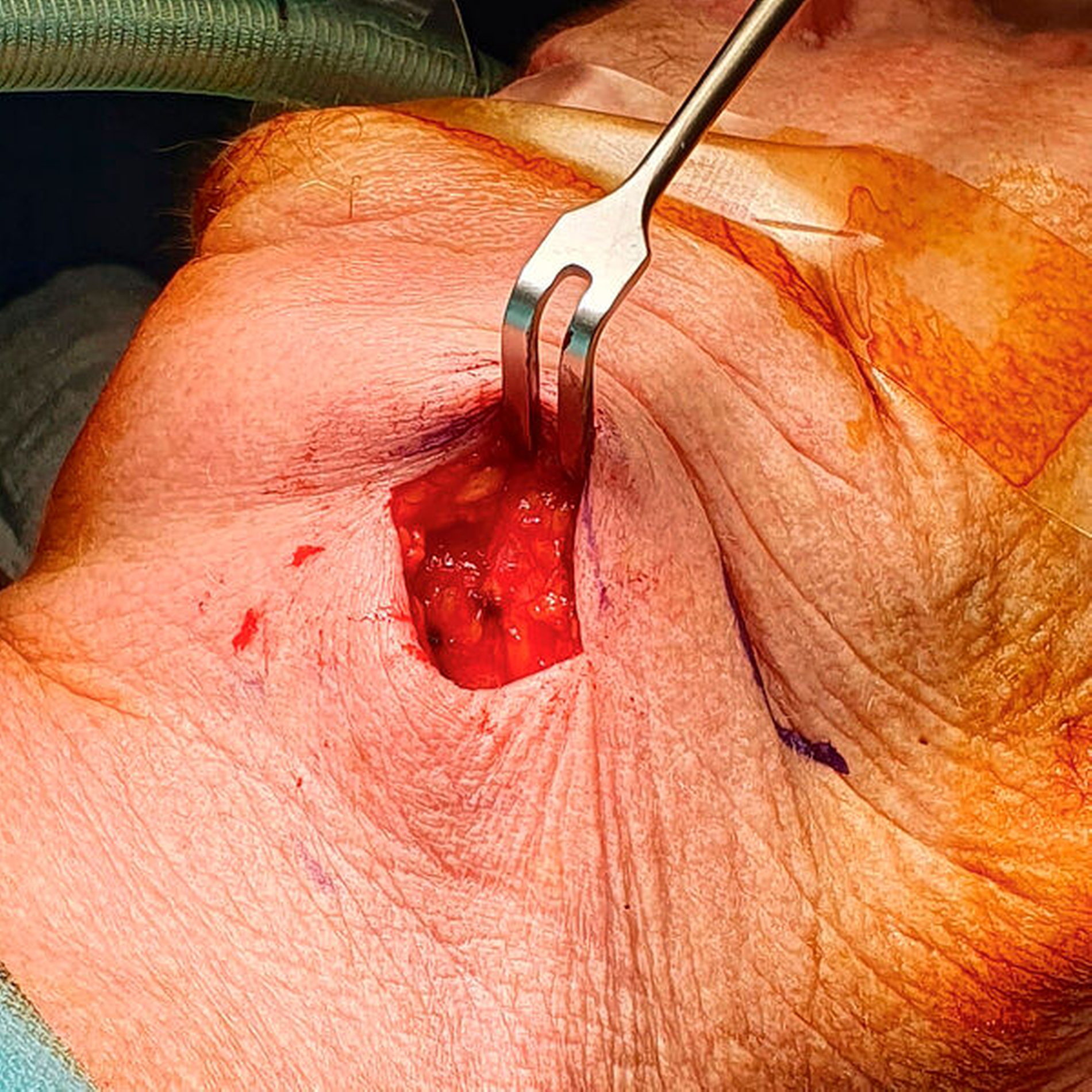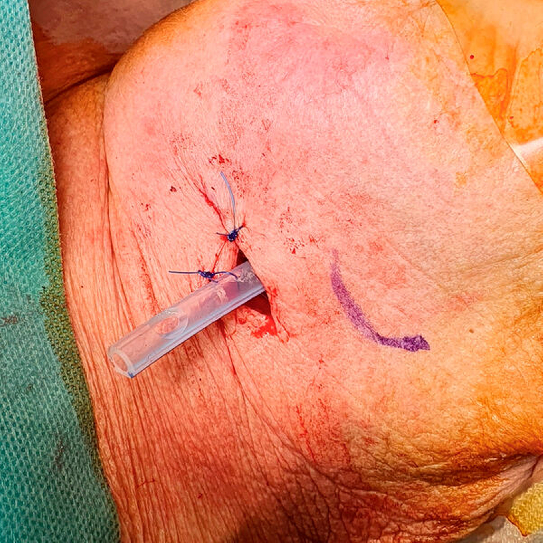 Die Therapie der Wahl besteht, – wie bei allen Abszessen – in der chirurgischen Eröffnung (Abbildung 3) und Drainage. Inzision und Drainage gelten hier nicht nur dem Abfluss des Pus, sondern sorgen darüber hinaus für die Penetration von Sauerstoff in die Abszesshöhle, was die anaeroben Erreger aufgrund ihrer Stoffwechseleigenschaften deutlich dezimiert (Abbildung 4).