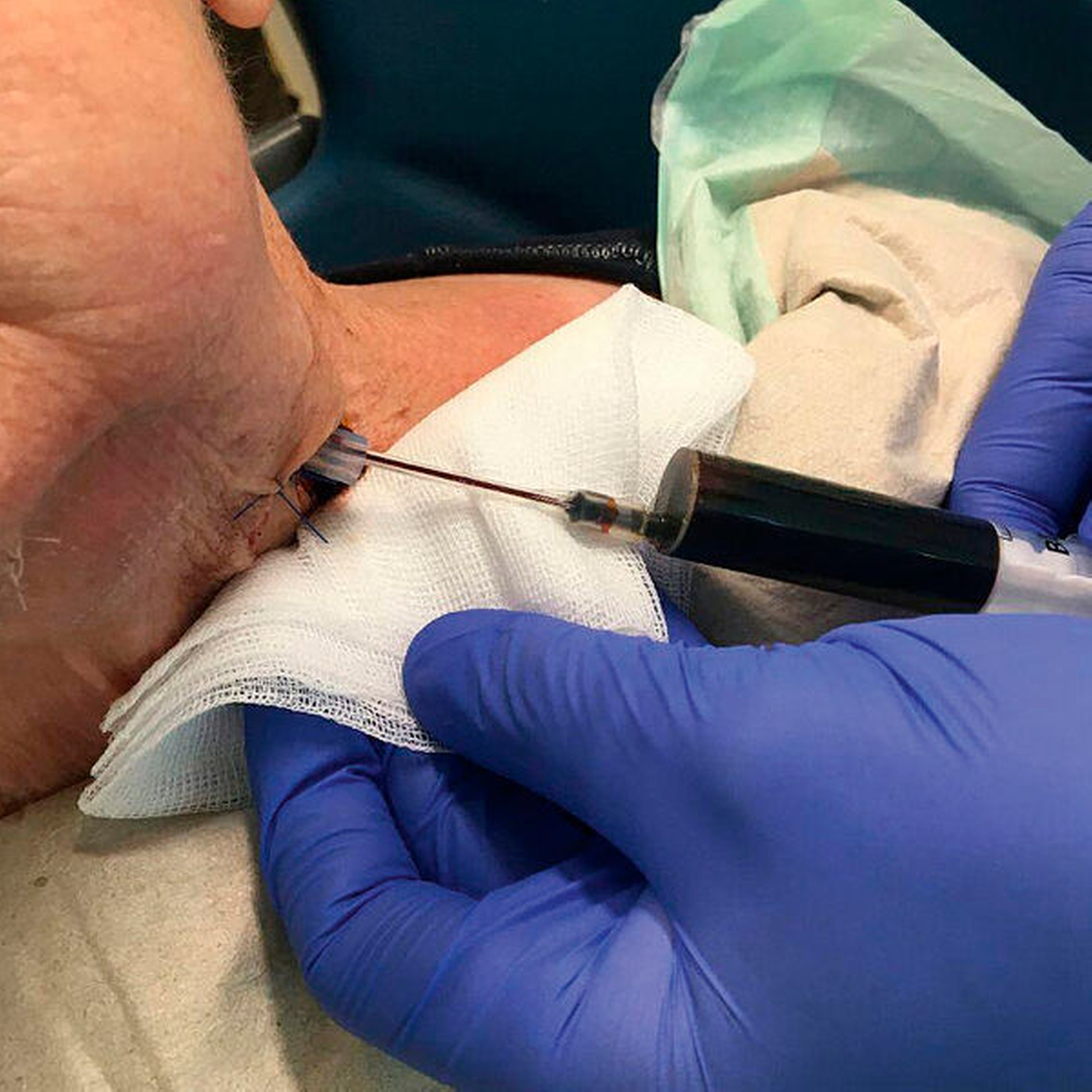 Die prompte Durchführung der chirurgischen Therapie verhindert meist septische Verläufe und die Ausbreitung in besonders sensible Gewebe (Orbita, Mediastinum, Wirbelsäule oder Neurokranium) sowie die Verlegung der Atemwege, die zu vital bedrohlichen Komplikationen führen kann [Heim et al., 2019]. Es folgt die regelmäßige Spülung der Abszesshöhle mit desinfizierenden Lösungen (zum Beispiel Betaisadona) (Abbildung 5).
