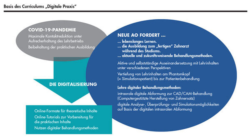 Das Curriculum „Digitale Praxis“ an der Klinik für Zahnärztliche Prothetik der Medizinschen Fakultät der RWTH Aachen wurde auf Basis der Eckpunkte der Corona-Pandemie und der Neuen Approbationsordnung mit den daraus resultierenden Maßnahmen definiert. Die Digitalisierung galt dabei als nützliches Werkzeug zur Umsetzung der Maßnahmen (Abbildung 1).