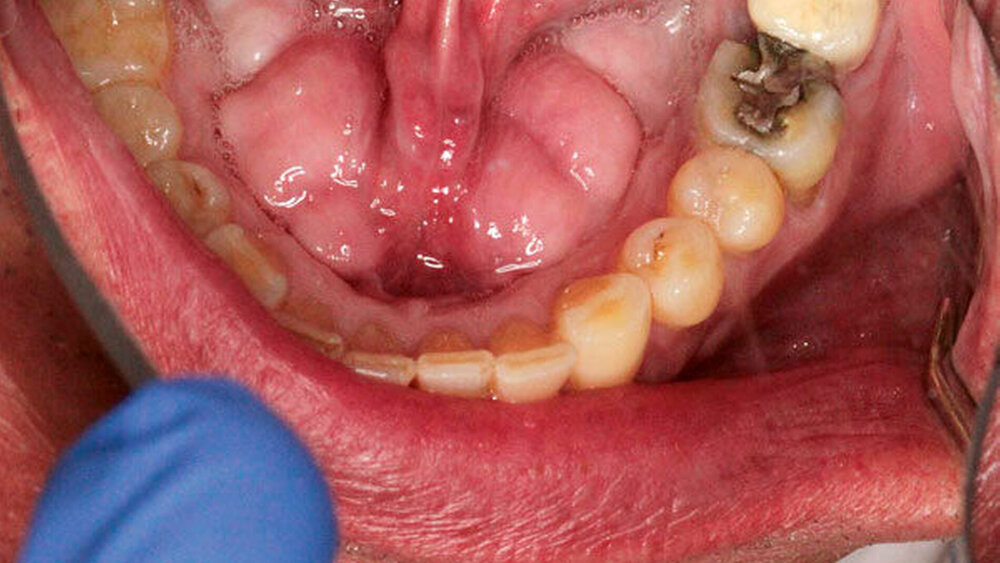 Klinisch präsentierte sich der Patient in gutem Allgemein- und Ernährungszustand ohne auffällige Familienanamnese. Bei der oralen Inspektion imponierten zwei Raumforderungen im Unterkiefer lingual beidseits mit einer Adhärenz zum Alveolarkamm (Abbildung 1). Auf Palpation gab der Patient keine Schmerzen an. Es bestanden keine Gefühls- oder Geschmacksstörungen.