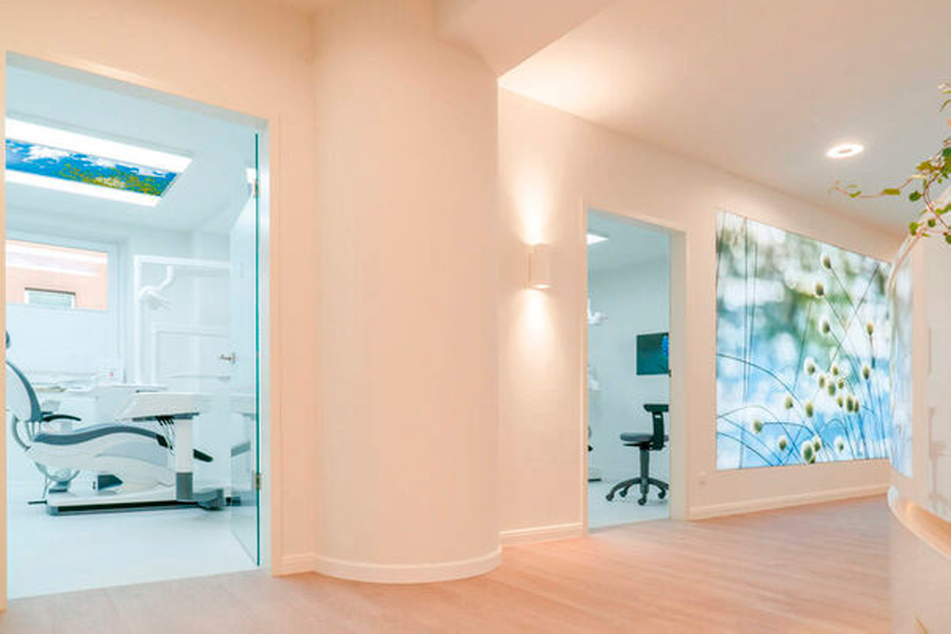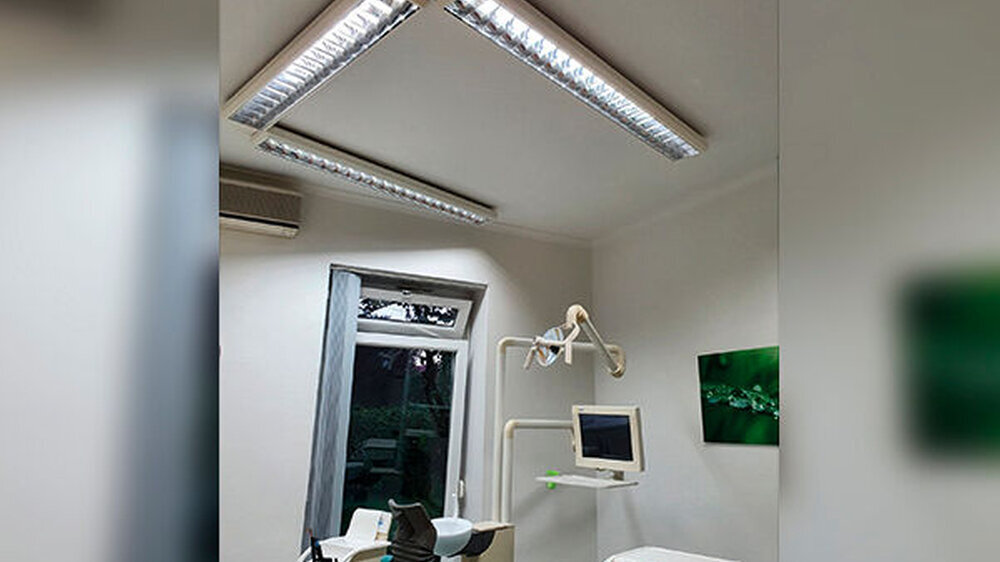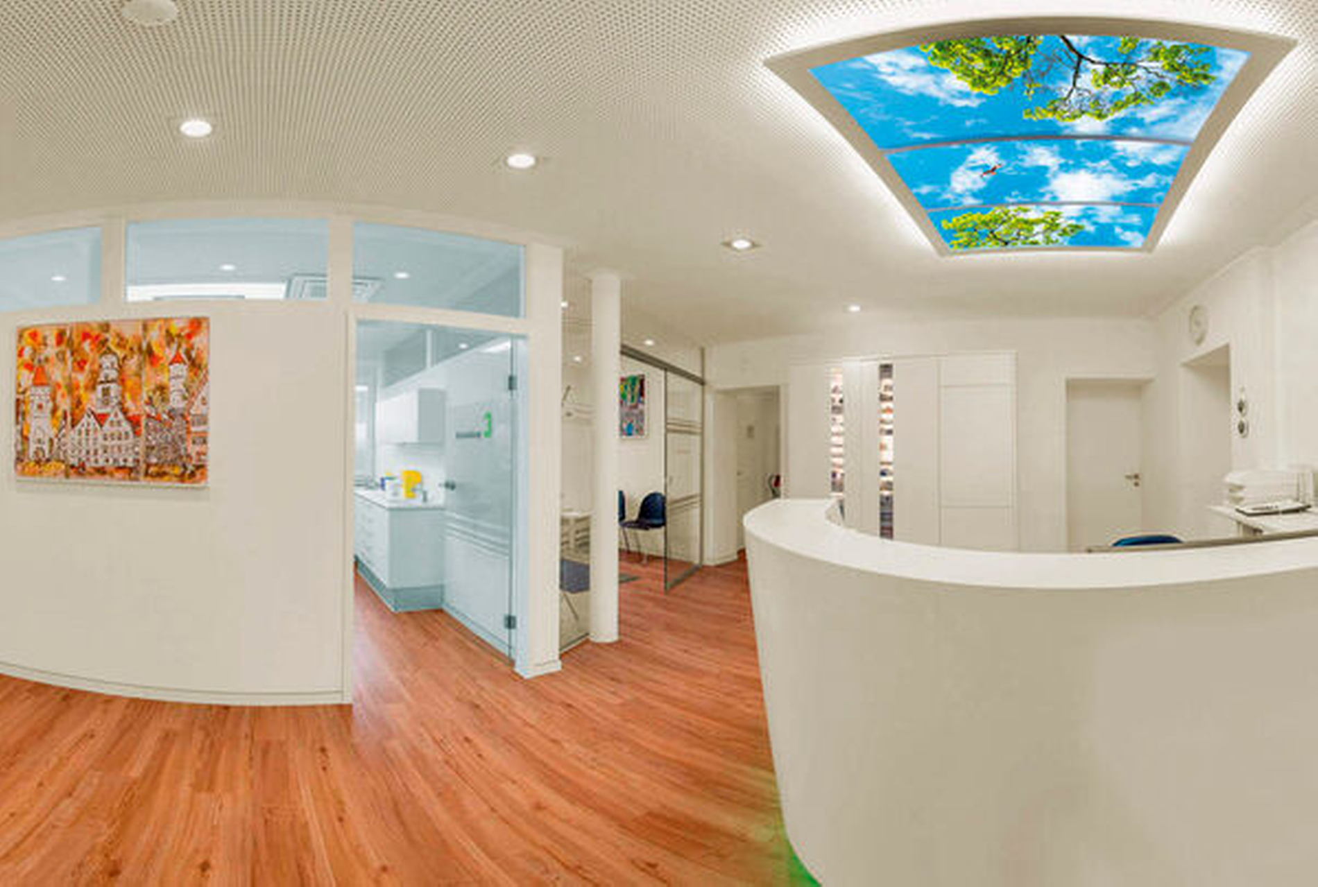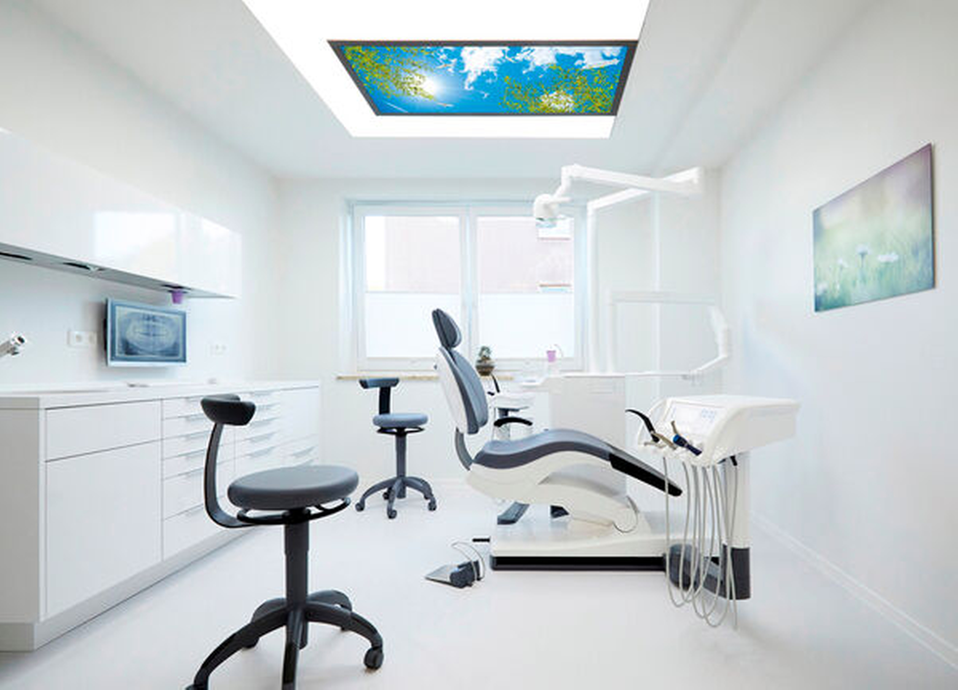 Für ihre neuen Räumlichkeiten mussten auch Antonia und Markus Kammerlander aus Biberach in Baden-Württemberg die Beleuchtung austauschen. Vorher war der Ort eine Gaststätte. Als sie auf die Leuchtbilder mit der Tageslichtumrandung stießen, orderten sie diese für ihre drei Behandlungszimmer und den Eingangsbereich. „Wir hatten keine Ahnung, wie das in echt aussehen würde, aber wir sind begeistert“, erzählt Markus Kammerlander. „Die Leuchten geben sehr gutes Licht zum Arbeiten – ohne Schattenwurf, sobald man den Kopf über den Patienten reckt. Das hat uns als praktischen Aspekt direkt nach der Installation überzeugt.“ Besonders bei den zahntechnischen Arbeiten und schwierigen Füllungen im Frontzahnbereich schätzt er das neue Licht. „Bei der Farbauswahl hilft es ungemein, dass das Licht wie echtes Tageslicht draußen vor der Haustür wirkt. Die Ergebnisse werden so natürlich und sehr zufriedenstellend für den Patienten – und somit auch für uns.“