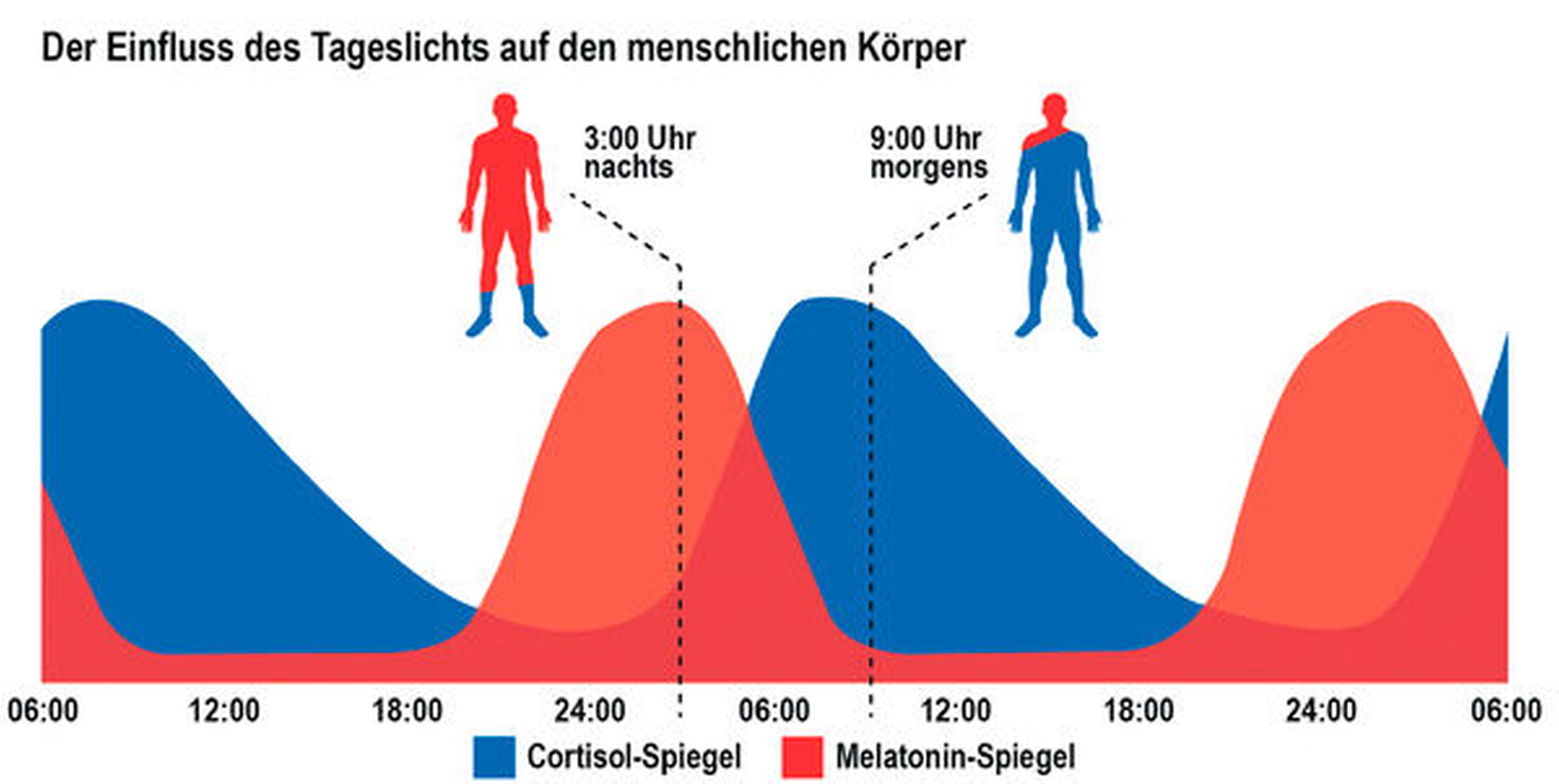 Einen wesentlichen Einfluss auf den zirkadianen Rhythmus nimmt das Hormon Melatonin. Es wird in der Zirbeldrüse des Zentralgehirns gebildet und reguliert durch seine Konzentration im Blutserum viele organische Vorgänge. So ist die Aktionsfähigkeit direkt mit der Höhe des Melatoninspiegels verbunden (Grafik). Liegt Melatonin in höherer Konzentration im Blut vor, stellt sich ein Müdigkeitsgefühl ein. Umgekehrt ist ein hoher Cortisolspiegel für die Wachphasen mitverantwortlich. Durch die direkt auf die Netzhaut auftreffende Lichtenergie wird die Melatonin- und die Cortisolproduktion gesteuert – unabhängig vom eigentlichen Sehvorgang. Viel Licht, besonders der kurzwellige Spektralanteil, lässt den Cortisolspiegel ansteigen und unterdrückt die Produktion von Melatonin. Entsprechend wird der Mensch wach, wenn es hell wird, und müde, wenn es dunkel wird.