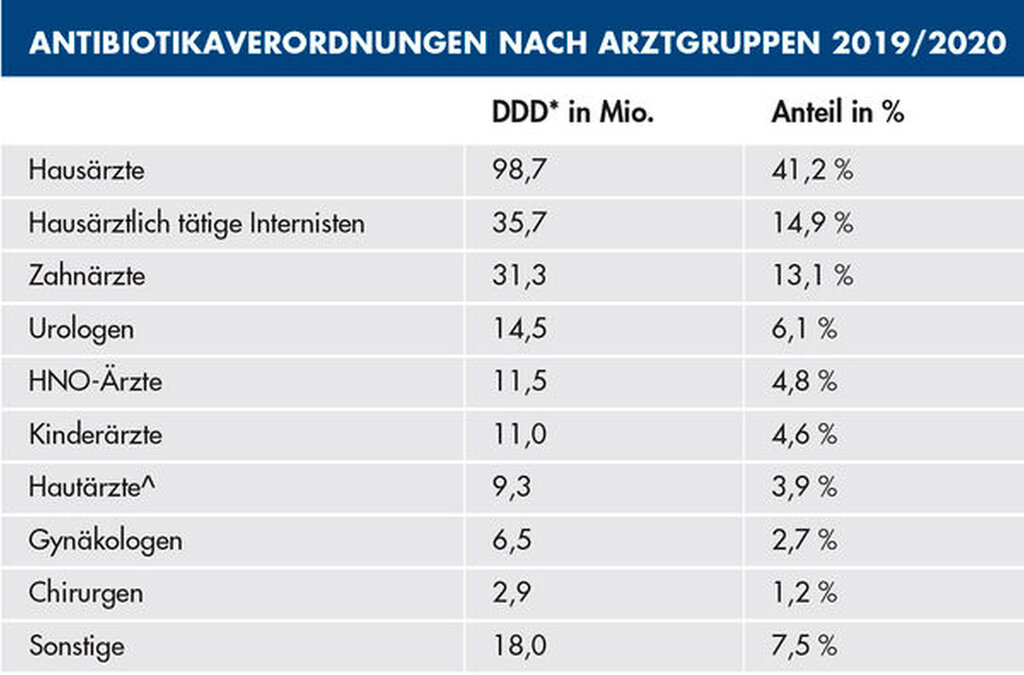 In der Corona-Pandemie stieg der ohnehin schon hohe Antibiotikaverbrauch sogar noch weiter an [Shah et al., 2020]. Derzeit entfallen knapp 13 Prozent des gesamten Antibiotikaverbrauchs im GKV-Bereich allein auf die Zahnmedizin (Tabelle) [WIdO, 2021]. Das unterstreicht die Wichtigkeit, die dieser im Kampf gegen die MRE-Pandemie zukommt. Gerade jetzt sind Antibiotic-Stewardship-Programme wichtiger denn je, dadurch können der Antibiotikaverbrauch gesenkt und die Zielgenauigkeit der Antibiotikaanwendungen deutlich gesteigert werden [Gross et al., 2019; Milani et al., 2019; Teoh et al., 2021]. So können uns auch in Zukunft Antibiotika als wirksames Therapieinstrument erhalten bleiben.