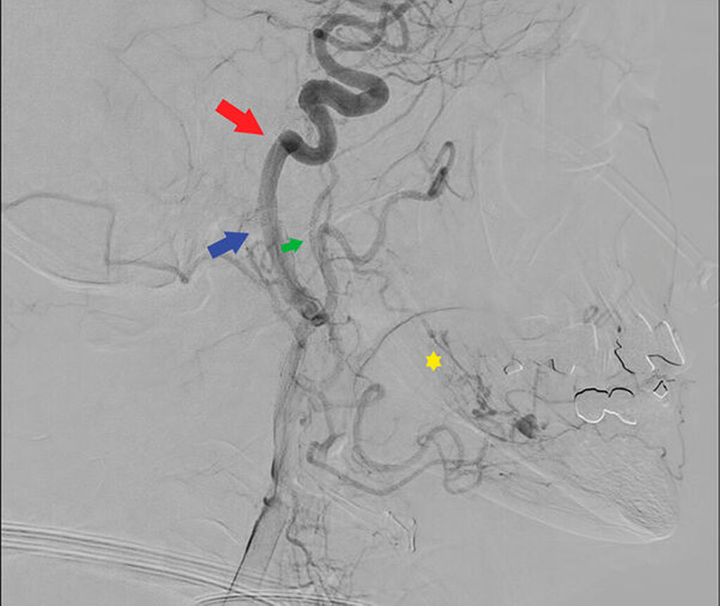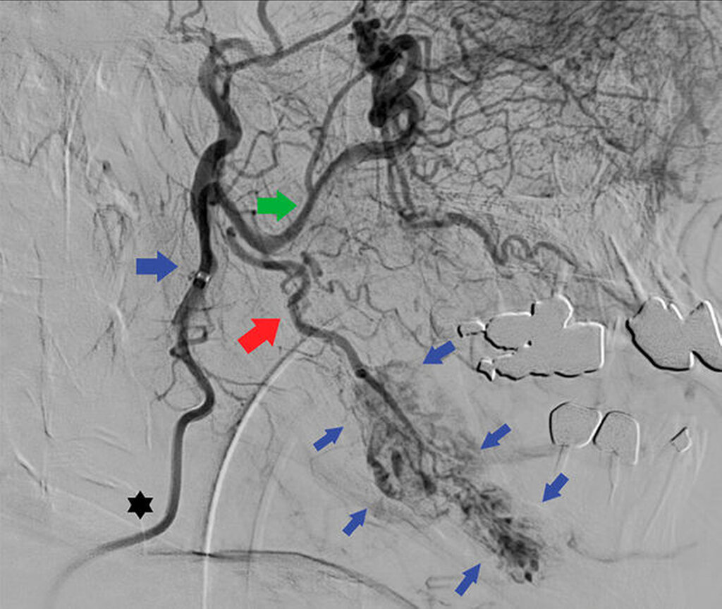 Als weitere diagnostische Abklärung wird anschließend eine transfemorale Katheterangiografie der kraniozephalen Gefäße in intraarterieller, digitaler Subtraktionsangiografie durchgeführt. Es wird eine osteodestruktive Formation mit kräftiger, blush-artiger, spätarterieller Kontrastmittelanreicherung mit teils dilatierten Venen und venösem Abfluss beschrieben. Weiterhin kann die linke Arteria facialis als arterieller Hauptfeeder identifiziert sowie ein pathologischer Zufluss von kontralateral ausgeschlossen werden (Abbildung 3).