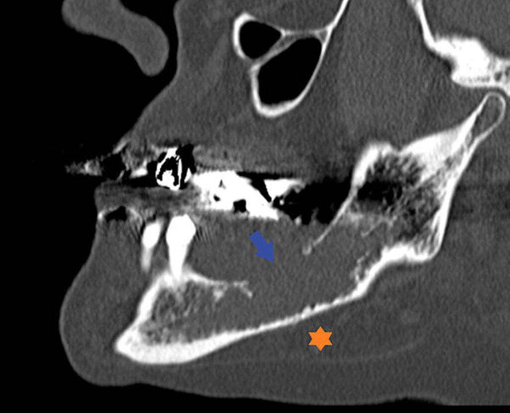 Der extraorale Untersuchungsbefund ist unauffällig. Enoral ist eine fluktuierende Schwellung im Bereich des zahnlosen Alveolarkamms des linken Unterkiefers tastbar. Im angefertigten Orthopantomogramm (OPTG) ist eine zystische Raumforderung im Bereich des Unterkiefers zu erkennen (Abbildung 1). In der anschließenden dreidimensionalen Bildgebung (CT) stellt sich eine glatt berandete, zystische Raumforderung im Bereich des linken Kieferwinkels dar (Abbildung 2).