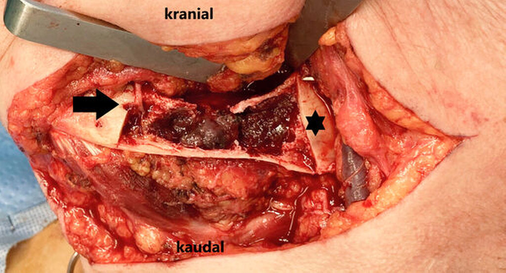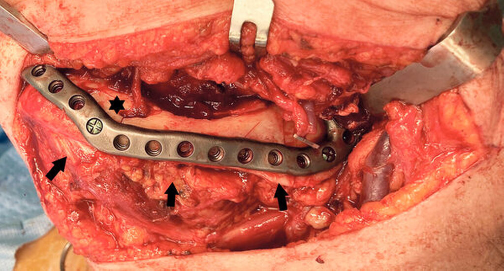 Am Folgetag wird das Hämangiom über einen extraoralen Zugang zunächst dargestellt, eine Osteotomie des Unterkiefers ohne Kontinuitätsunterbrechung mittels Piezo-Chirurgie vorgenommen (Abbildung 5) und unter Erhalt des Nervus alveolaris inferior vollständig reseziert (Abbildung 6). Es kommt zu keinem übermäßigen Blutverlust. Die zuvor eingekreuzten Blutkonserven werden nicht benötigt. Im Anschluss wird die vestibuläre Kortikalis mit einem patientenspezifischen Implantat belastungsstabil refixiert (Abbildung 7). Die orale Antikoagulation wurde zwei Tage präinterventionell pausiert und perioperativ halbtherapeutisch mit Tinzaparin überbrückt. Nach zwei blutungsfreien Tagen konnte das Rivaroxaban komplikationslos angesetzt werden.