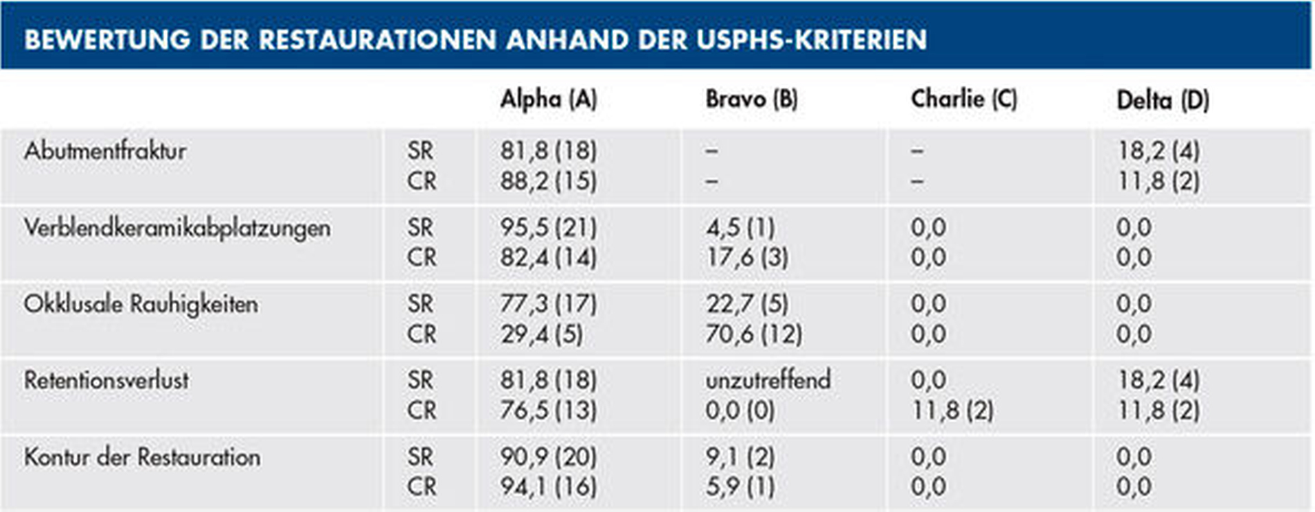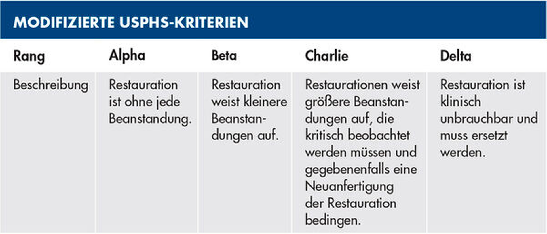 Alle Patienten wurden ins Nachsorgeprogramm der Klink aufgenommen – die Hygieneintervalle waren an die patientenindividuellen Bedürfnisse angepasst. Nach ein bis drei Wochen (Baseline) und dann nach sechs, zwölf, 36 und 60 Monaten erfolgten Nachuntersuchungen, bei denen neben klinischen Parametern auch Röntgenbilder angefertigt wurden. Als biologische Zielgrößen in der Datenauswertung dienten parodontale Parameter wie Taschensondierungstiefen, Blutung auf Sondierung, Plaque, Rezessionen, die Breite der keratinisierten Mukosa, die Dicke der bukkalen Mukosa und der Papillenindex nach Jemt. Der krestale Knochenverlust wurde anhand standardisierter Zahnfilmröntgenaufnahmen ausgewertet. Die prothetische Beurteilung der Kronen erfolgte anhand der modifizierten USPHS(United States Public Health Service)-Kriterien (Tabelle 1).