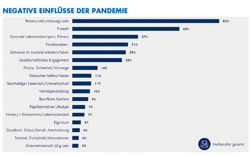 Auf die Frage nach den Gründen für diese Verschiebung sehen nur 14 Prozen einen Zusammenhang mit der Corona-Krise. Was die Auswirkungen der Pandemie betrifft, so hat vor allem das Privatleben gelitten: Die Befragten fühlen sich beim Reisen (80 Prozent), in ihrer Freizeit (60 Prozent), bei gesunder Lebensweise und Fitness (37 Prozent) sowie im Familienleben (31 Prozent) und bei ihrem gesellschaftlichen Engagement (28 Prozent) beeinträchtigt. Negative Folgen auf ihre berufliche Karriere sehen hingegen lediglich 9 Prozent.