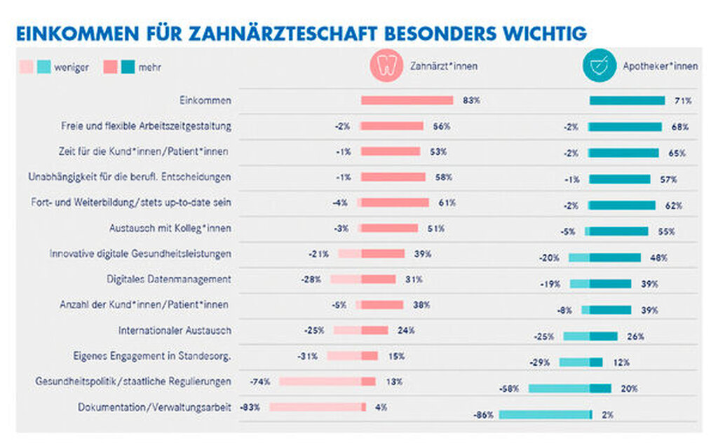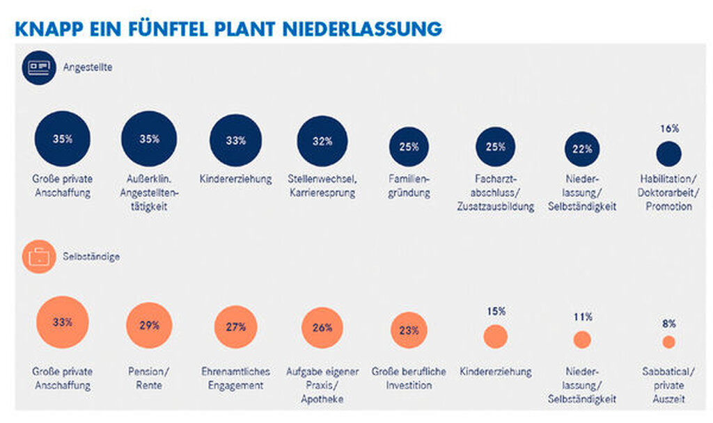 Nach den Vorhaben für die nächsten drei Jahre befragt, nennen 22 Prozent der angestellten Heilberuflerinnen und Heilberufler die Niederlassung beziehungsweise Selbstständigkeit, insgesamt plant ein Drittel einen Karrieresprung, für genauso viele steht aber auch Kindererziehung auf der Agenda. Die im Schnitt älteren Niedergelassenen haben andere Pläne: Für 29 Prozent steht die Vorbereitung auf den Ruhestand an und damit die Abgabe der eigenen Praxis oder Apotheke. 27 Prozent planen, sich ehrenamtlich zu engagieren.