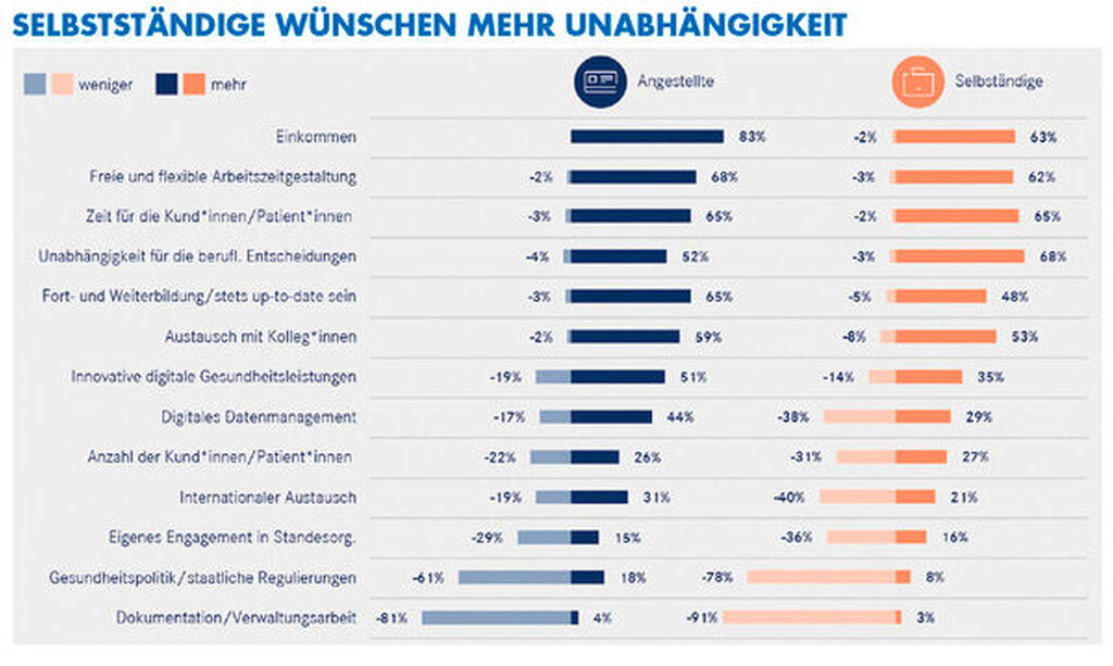 Der Wunsch nach weniger Dokumentations- und Verwaltungsarbeit bleibt weiterhin ganz oben auf der Liste, vor allem für Selbstständige (91 Prozent). Zwei Drittel der Befragten wünschen sich auch mehr Zeit für die Patienten.