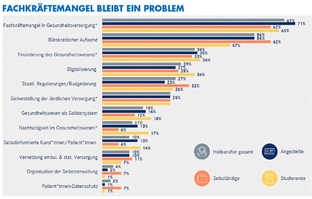 Die Baustellen im Gesundheitswesen sind nach Ansicht der Befragten vor allem der Fachkräftemangel (67 Prozent), die Bürokratie (56 Prozent) und die Finanzierung des Gesundheitswesens (34 Prozent). Das hier wenig passiert, sorgt für Unzufriedenheit.