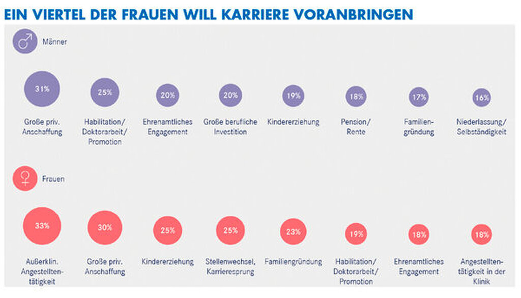 Zum Geschlechtervergleich: Die Mehrheit der befragten Frauen ist angestellt, die der Männer niedergelassen – entsprechend unterschiedlich ist die Karriereplanung. Während jede vierte Heilberuflerin einen Karrieresprung plant, haben dies nur 15 Prozent der männlichen Kollegen vor. Dabei strebt ein Drittel der Frauen eine Anstellung außerhalb des Klinikbetriebs an, 13 Prozent wollen sich niederlassen.