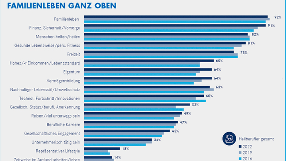 Die Pandemie hat die Prioritäten verschoben. Den höchsten Stellenwert hat nach wie vor das Familienleben, mit 92 Prozent ist es den Befragten aber nur minimal wichtiger als finanzielle Sicherheit – der Wert lag 2016 bei 85 Prozent und ist auf 91 Prozent gestiegen. Wichtiger finden die Heilberufler auch ein hohes Einkommen und den Lebensstandard (von 58 Prozent auf 65 Prozent), Eigentum (von 56 Prozent auf 64 Prozent) oder die Vermögensbildung (von 55 Prozent auf 64 Prozent).
