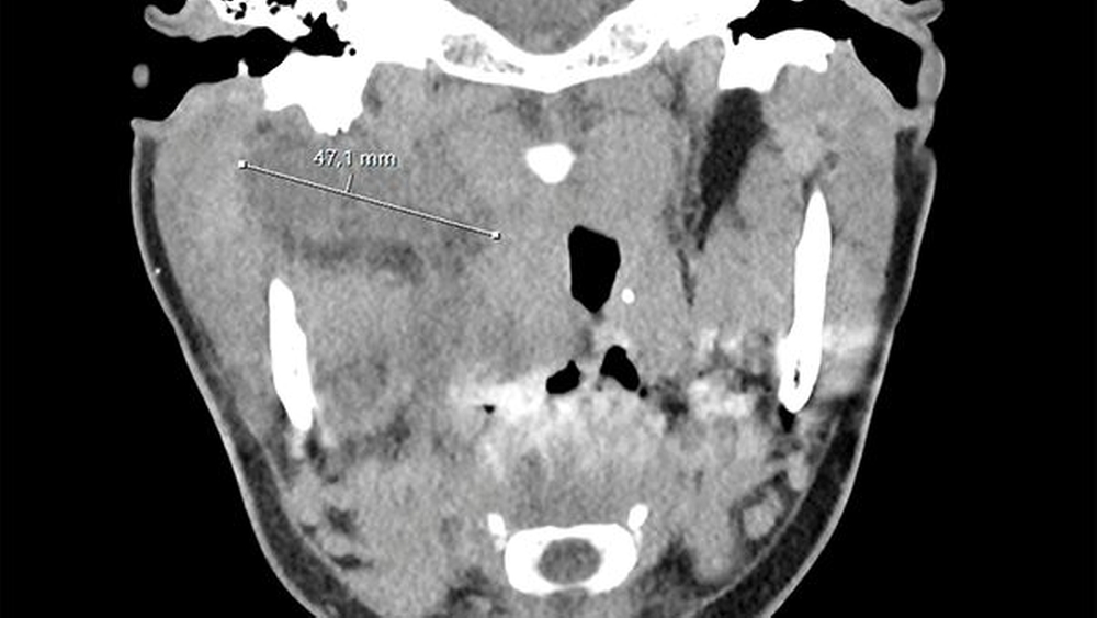 Die Patientin stellte sich notfallmäßig in der Poliklinik der Mund- Kiefer- und Gesichtschirurgie der Universitätsmedizin Mainz vor. Sie berichtete über leicht febrile Temperaturen bis 39 Grad Celsius, ein Krankheitsgefühl und eine progrediente Einschränkung der Mundöffnung. Drei Tage zuvor war durch einen niedergelassenen Zahnarzt eine konservierende Therapie eines Molaren im rechten Unterkiefer durchgeführt worden. Dieser Eingriff erfolgte in lokaler Schmerzausschaltung mittels Leitungsanästhesie des rechten Nervus alveolaris inferior. Unmittelbar nach dem Eingriff passierte zunächst laut Patientin eine normale Regression der Anästhesie ohne Beschwerden. Bereits am Folgetag beklagte die Patientin allerdings eine schmerzhafte Einschränkung der Mundöffnung mit Druckdolenz der rechten Wange. Eine erneute Konsultation des niedergelassenen Zahnarztes zeigte zunächst keine klinischen Anzeichen eines abszedierenden Geschehens oder einer akut interventionsbedürftigen Situation. Zur Prophylaxe einer entzündlichen Situation wurde sich für die Gabe eines oralen Antibiotikums entschieden.