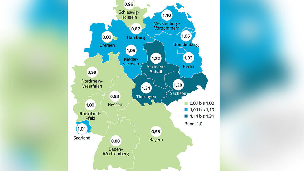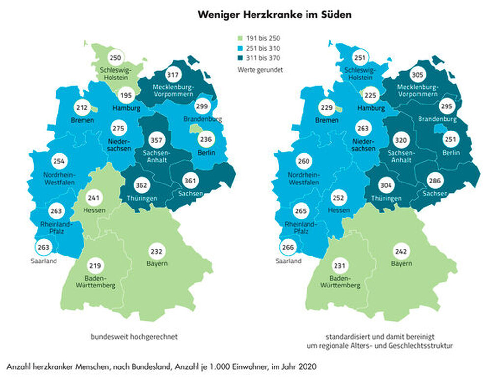 Dem Atlas zufolge gibt es nicht nur bei der Krankheitslast insgesamt deutliche regionale Unterschiede, sondern auch bei einzelnen Erkrankungen. Ein Beispiel dafür sind Herzerkrankungen. So liegt der Anteil der Herzkranken in Thüringen, Sachsen und Sachsen-Anhalt um bis zu 40 Prozent über dem Bundesdurchschnitt. In diesen drei Bundesländern hatten im Jahr 2020 zwischen 357 und 362 von 1.000 Einwohnern Herzerkrankungen. Die gesündesten Herzen hatten demnach die Hamburger, Bremer und Baden-Württemberger mit 195 bis 219 Betroffenen je 1.000 Einwohner.