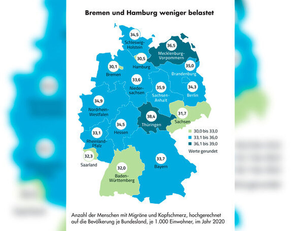 Ein weiteres Beispiel: Migräne oder Kopfschmerzen. Auch hier gibt es regionale Unterschiede. So hatten in Bremen 30, in Hamburg 31 und – am häufigsten – in Thüringen 38 je 1.000 Einwohner Migräne beziehungsweise Kopfschmerzen. Betrachtet man die einzelnen Landkreise in ganz Deutschland reichte die Spanne sogar von 25 bis 57 Betroffenen je 1.000 Einwohner und zwar in den Kreisen Lörrach und Hildburghausen. Dabei ist der Anteil der betroffenen Frauen bundesweit mehr als dreimal so hoch wie der der Männer.