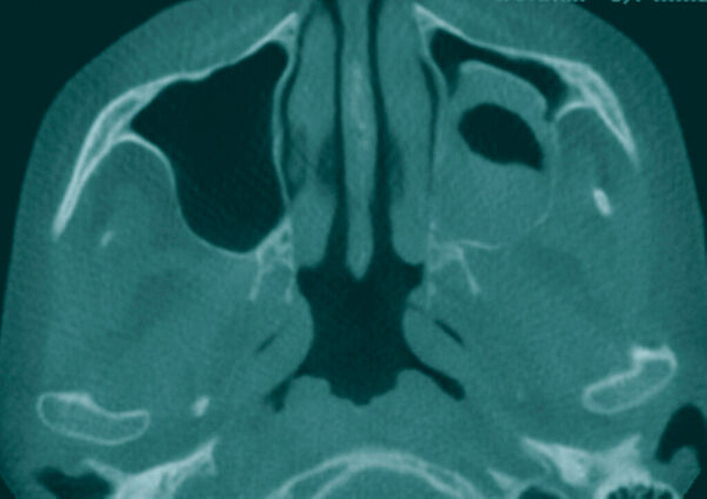 Eine 62-jährige Patientin ohne Nebenerkrankungen stellte sich zur weiteren Therapie eines histologisch gesicherten Ameloblastoms im Bereich der linken Kieferhöhle vor, das im Rahmen einer Zahnsanierung bei einem niedergelassenen Oralchirurgen aufgefallen war. Der zahnärztliche Kollege hatte vier Wochen nach Extraktion des nicht erhaltungswürdigen Zahnes 27 aufgrund einer nicht abheilenden Wunde eine histologische Probebiopsie entnommen und ein plexiformes Ameloblastom diagnostiziert.