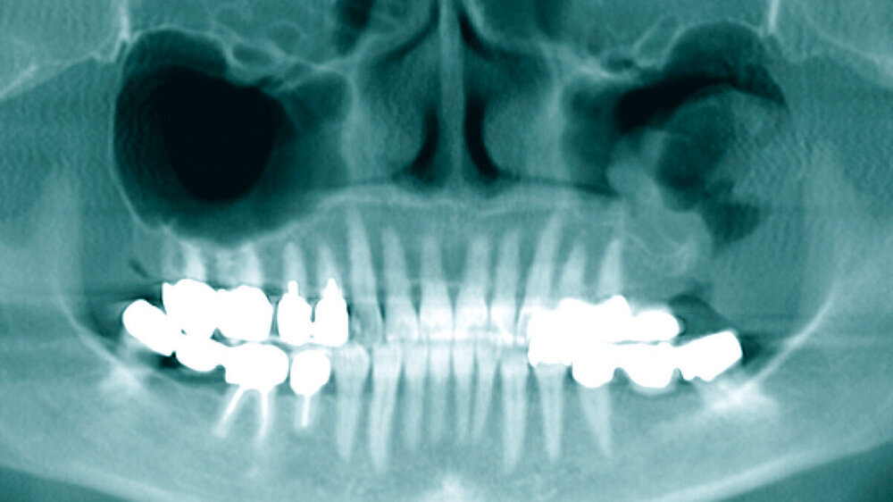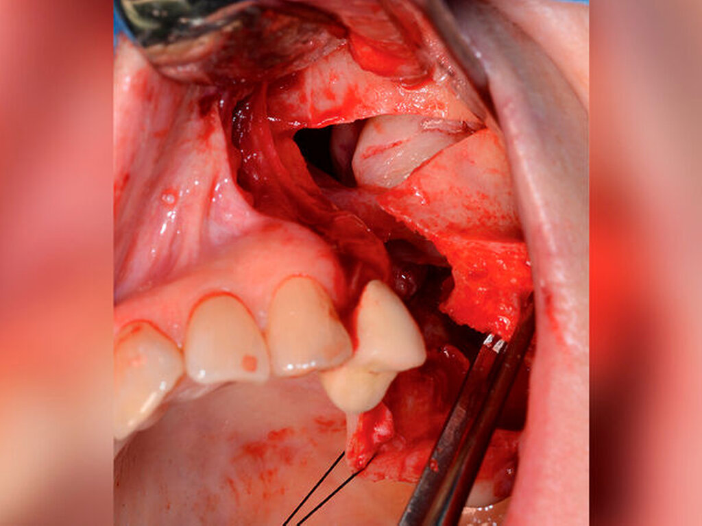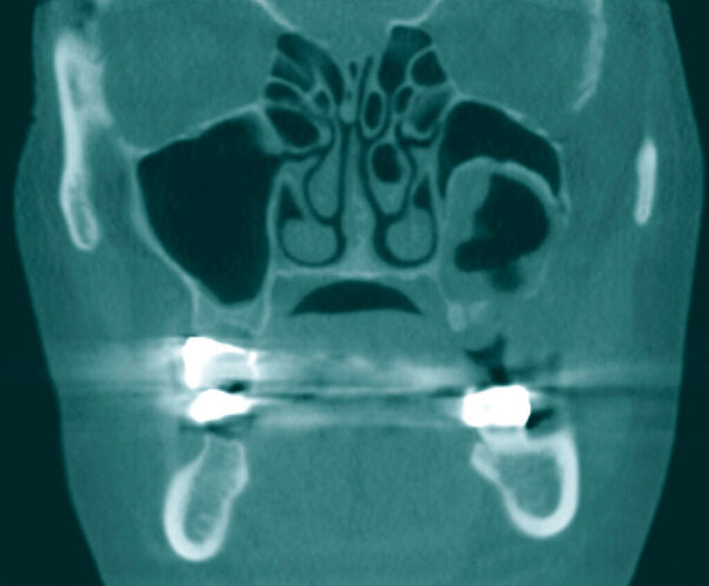 Anamnestisch gab die Frau keine Schmerzen an, sie verspürte lediglich ein minimales Druckgefühl. Bei der klinischen Untersuchung zeigte sich enoral eine Mund-Antrum-Verbindung (MAV). Extraoral fanden sich keine Sensibilitätsstörungen im Versorgungsgebiet des N. trigeminus.