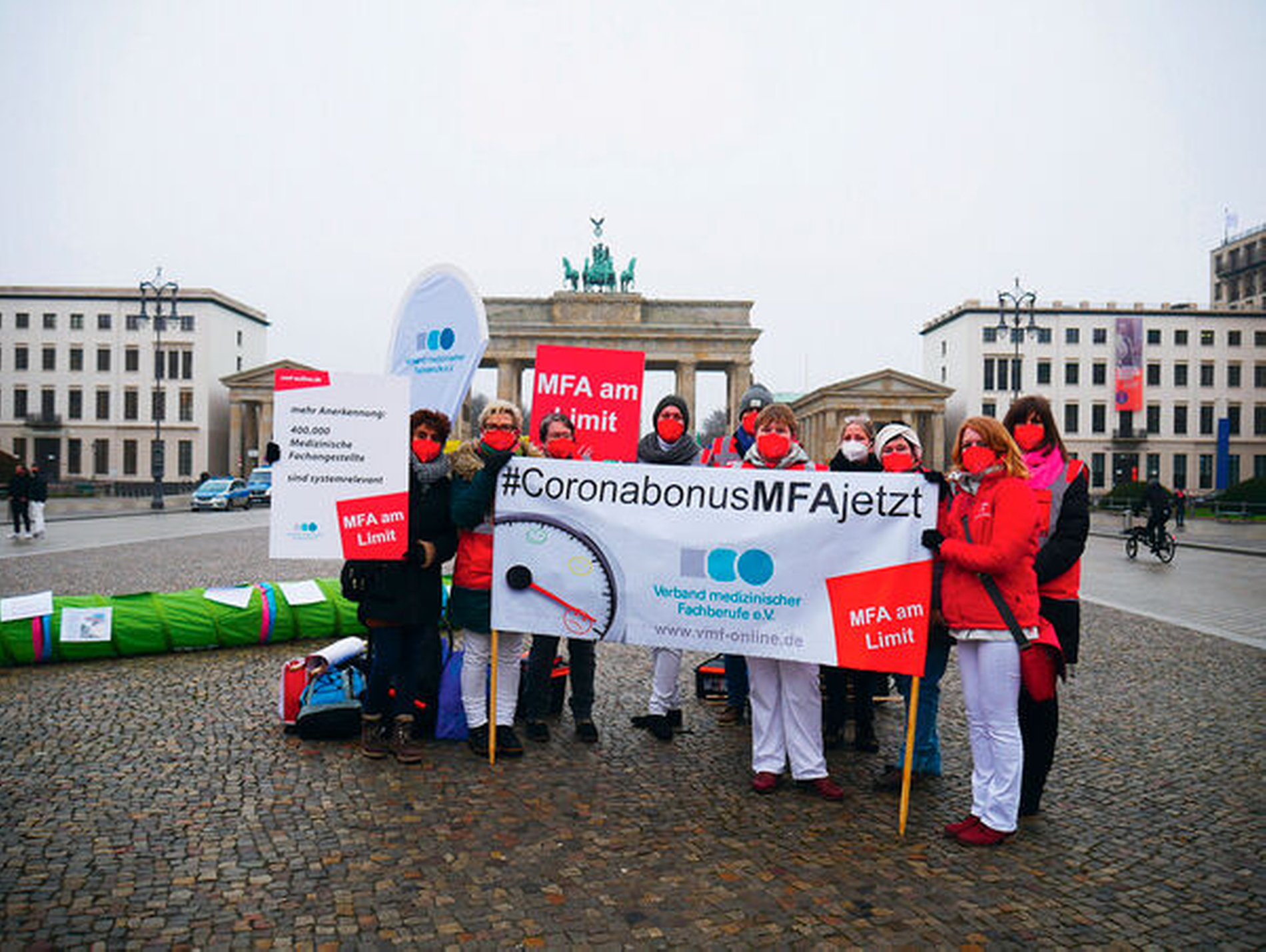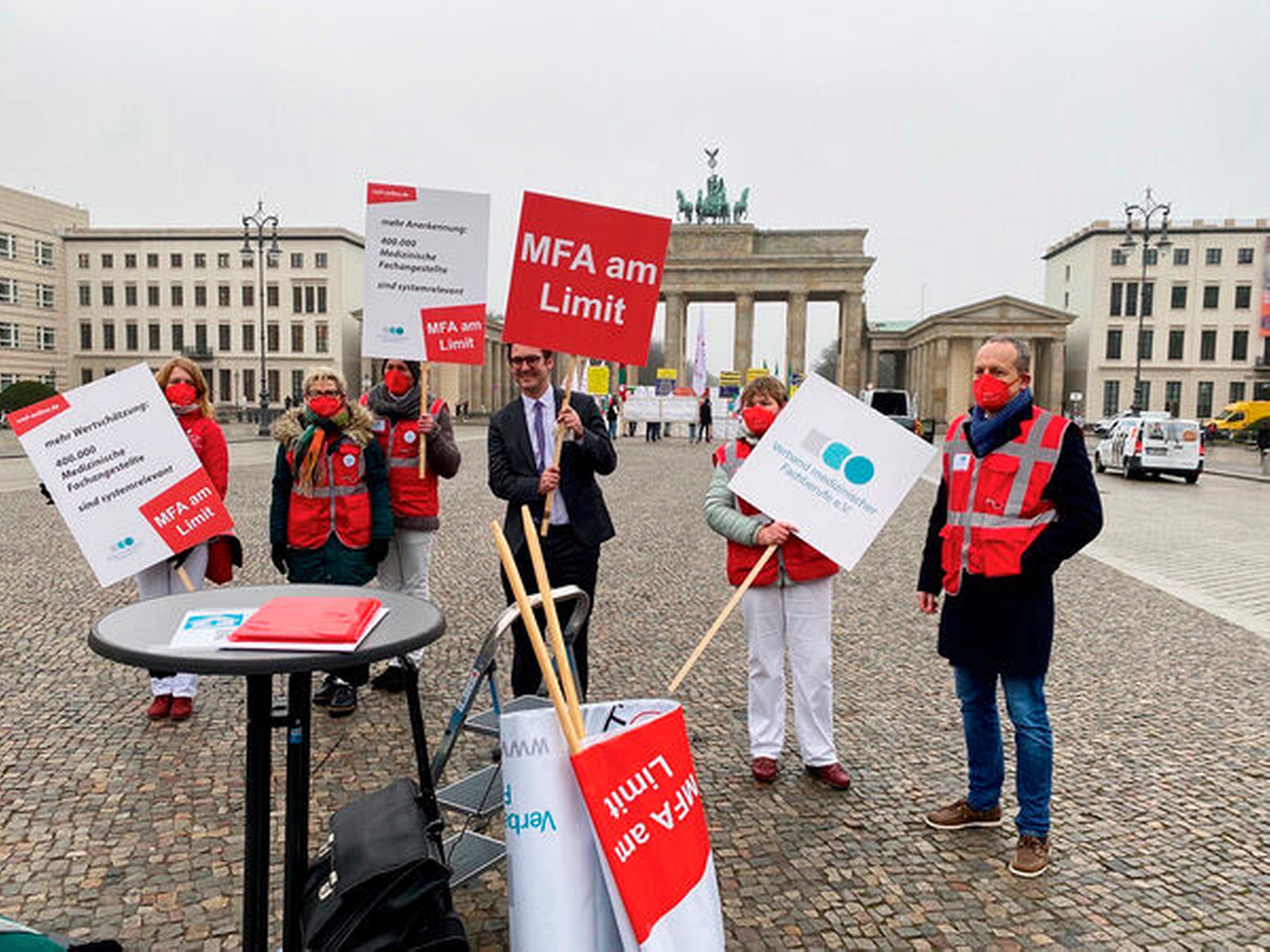 Bei der Protestaktion adressierten die Betroffenen ihr Anliegen noch einmal direkt an die anwesenden politischen Vertreter. König: „Wir konnten in unseren Gesprächen mit den Bundestagsabgeordneten neben der fehlenden Wertschätzung und Anerkennung für die Leistungen der Medizinischen Fachangestellten auch auf die Situation der Zahnmedizinischen Fachangestellten hinweisen. Denn auch sie werden von der Politik und der Öffentlichkeit nicht gesehen, obwohl sie zur kritischen Infrastruktur gehören und an der Seite der Zahnärzteschaft die zahnärztliche Versorgung sichern.“