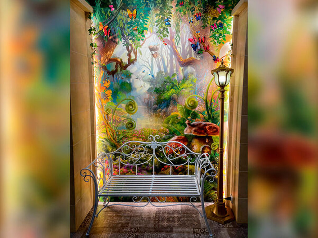 Links vom Tresen öffnet sich ein spärlich beleuchteter Gang, von dem mehrere Holztüren mit schweren Goldbeschlägen und verschnörkelten Türgriffen abzweigen. Rechts steht ein Wandschrank, der aussieht, als stamme er direkt aus den „Chroniken von Narnia“. Öffnet man die beiden mit aufwendigen Holzschnitzereien verzierten Flügeltüren, betritt man eine Dschungellandschaft: Von der Decke ranken Pflanzen und Blüten, ein Plüschaffe hängt an einem Ast und riesige Baumwurzeln formen eine mit Kissen und Kuscheltieren ausgestattete Höhle.