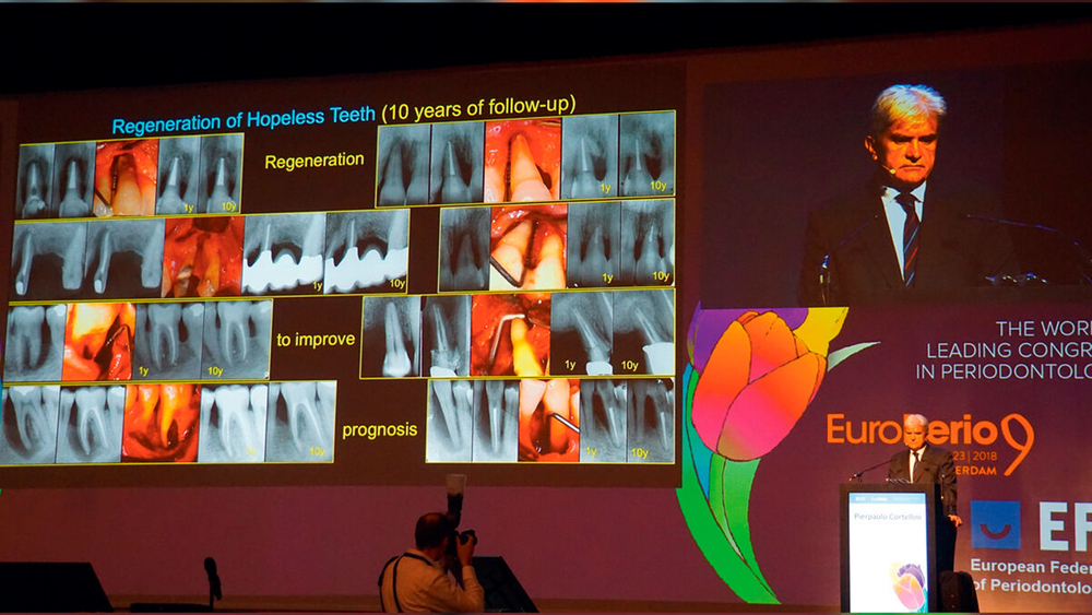 Das Team um Sandro Cortellini (Florenz) und Maurizio Tonetti (Hongkong) hat bei 50 Patienten mit Parodontitis im Stadium III oder im Stadium IV jeweils bei einem parodontal stark geschädigten Zahn mit parodontalem Attachmentverlust bis zum Apex oder sogar darüber hinaus nach deren Randomisierung eine der beiden beschriebenen Therapieoptionen angewendet. Es wurde darauf geachtet, dass an den unmittelbar benachbarten Zähnen ein hohes Knochenniveau vorhanden war. In der einen Gruppe wurde nach vorhergehender anti-infektiöser Therapie der regenerative chirurgische Eingriff mit Papillenerhaltungstechnik und Applikation von Biomaterial (Schmelzmatrixproteine, (nicht-)resorbierbare Membranen, Knochenersatzmaterialien) vorgenommen. Zuvor waren gelockerte Zähne geschient und – wenn erforderlich – endodontische Behandlungen durchführt worden. In der anderen Gruppe wurde nach Zahnextraktion und Weich- und Hartgewebsaugmentation ein Implantat inseriert und mit einer Krone versorgt oder alternativ eine zahngetragene Brücke eingesetzt. Anschließend fanden alle drei Monate eine unterstützende Parodontaltherapie und jährliche Nachuntersuchungen statt. Die statistische Auswertung beinhaltete Analysen des Überlebens der Zähne beziehungsweise des Zahnersatzes, des Auftretens von biologischen und technischen Komplikationen, der Kosten sowie der Patientenzufriedenheit.
