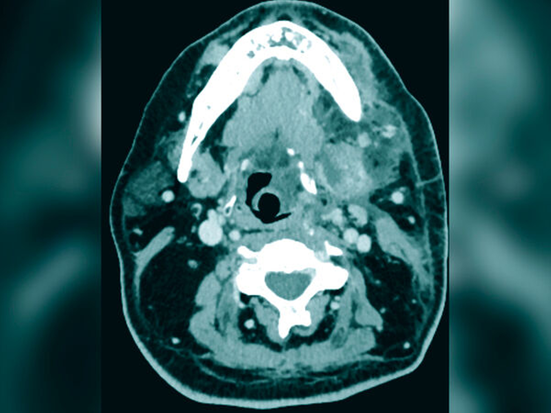 Eine angefertigte Panoramaschichtaufnahme zeigte ein konservierend und prothetisch unvollständig versorgtes Gebiss mit einem wurzelkanalbehandelten Zahn 36 und einer apikalen Osteolyse (Abbildung 1). Angesichts des ausgedehnten Abszessgeschehens wurde eine notfallmäßige Computertomografie zur erweiterten Diagnostik durchgeführt. Hier zeigte sich ein großflächiger Abszess des linken Unterkiefers mit einer Ausbreitung in die Tonsillenregion sowie in die Halslogen mit begleitenden einschmelzenden Prozessen (Abbildung 2). Zusätzlich zeigten sich im initial angefertigten Blutbild des Patienten ein Procalcitonin von 10 ng/ml, eine Blutglukose von 1.034 mg/dl sowie ein HBA1c-Wert von 13 Prozent. In der Zusammenschau der Befunde konnte somit von einem beginnenden septischen Krankheitsbild ausgegangen werden.