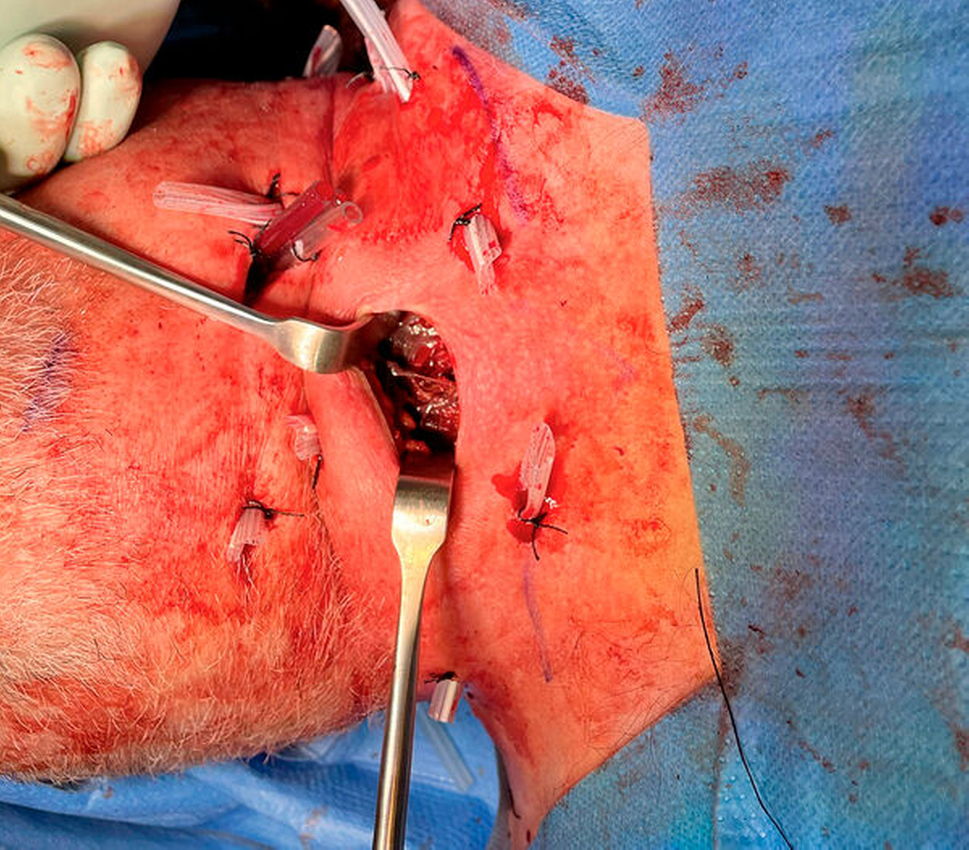 Es bestand die Indikation zur notfallmäßigen chirurgischen Intervention mittels Abszessdrainage. Hierzu erfolgten zunächst die Eröffnung der submandibulären und der perimandibulären Kompartimente über eine extraorale Schnittführung sowie die Extraktion des Zahnes 36. Darüber hinaus wurden die zervikalen und die jugulären Muskelfaszien zur weiteren Entlastung des entzündlichen Geschehens eröffnet. Bei der Drainage zeigte sich neben dem erwarteten Pus- und Blutabgang auch der Abgang von nekrotisch verändertem Muskelgewebe und gebildetem Gas nahezu im gesamten Halsbereich (Abbildung 3). Nach dem Debridement wurde der Wundbereich großzügig gespült. Abschließend wurden multiple Drainagen in die eröffneten Logen eingebracht und mittels Annaht fixiert (Abbildung 4).