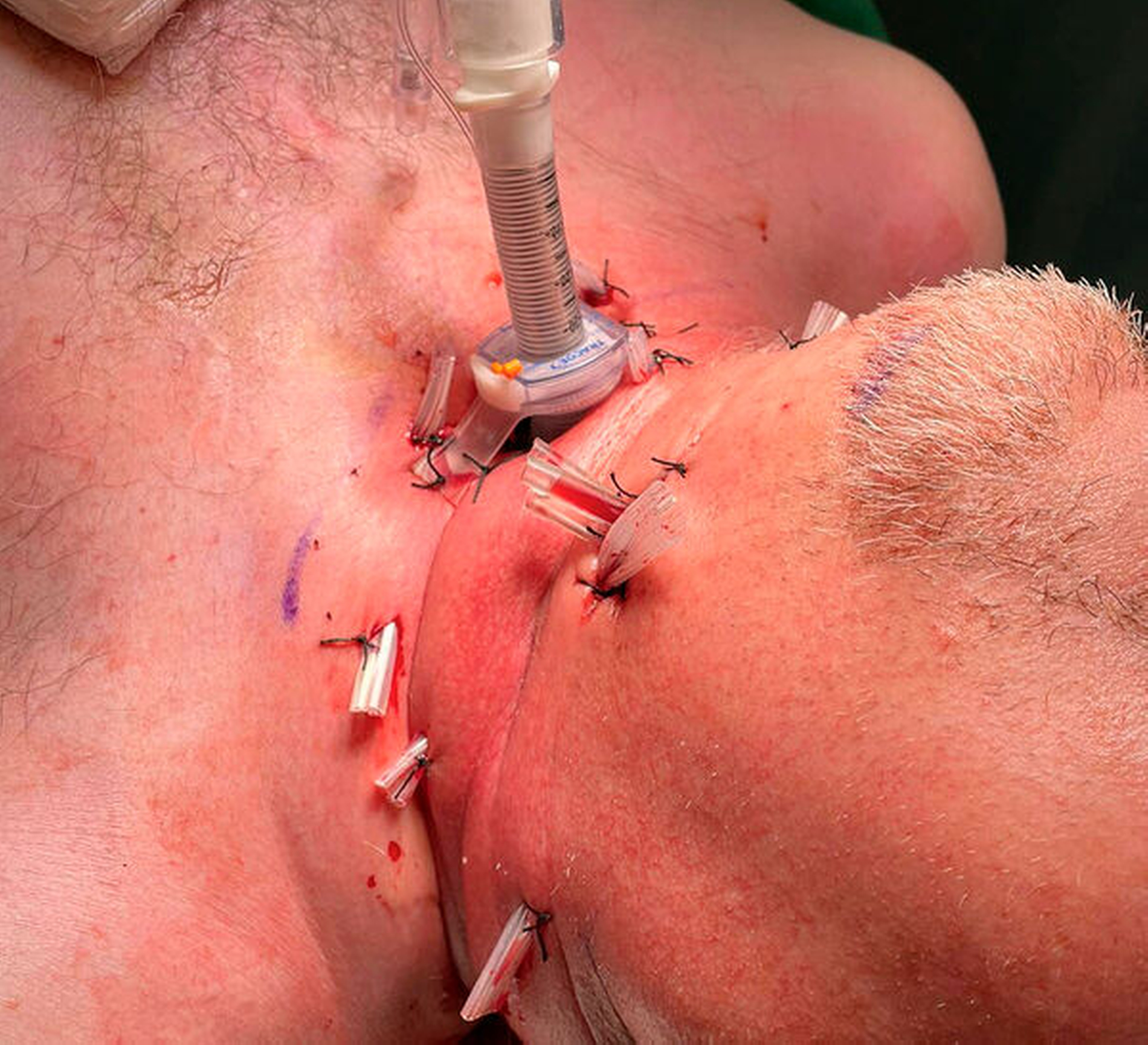 Die erfolgreiche Therapie der nekrotisierenden Fasziitis umfasst ein multidisziplinäres Therapieregime. Eine frühe Diagnose, eine kalkulierte Hochdosisantibiotikatherapie sowie ein ausgedehntes Wunddebridement gehören zum Standard in der Therapie. Entscheidend ist hierbei in erster Linie ein zeitnahes und ausgedehntes chirurgisches Wunddebridement, das nicht selten im Erkrankungsverlauf wiederholt werden muss. Bei fulminanten Verläufen sollte an eine Atemwegssicherung mittels Tracheotomie gedacht werden, auch um erschwerte Reintubationen bei erneuter chirurgischer Wundtoilette zu vermeiden. In vielen Fällen ist eine intensivmedizinsche Behandlung der Patienten unabdingbar [Kämmerer et al., 2017; Goetze und Kämmerer, 2020]. Zusätzliche Therapieformen wie eine hyperbare Sauerstofftherapie können ebenfalls zum Einsatz kommen [Flanagan et al., 2009].