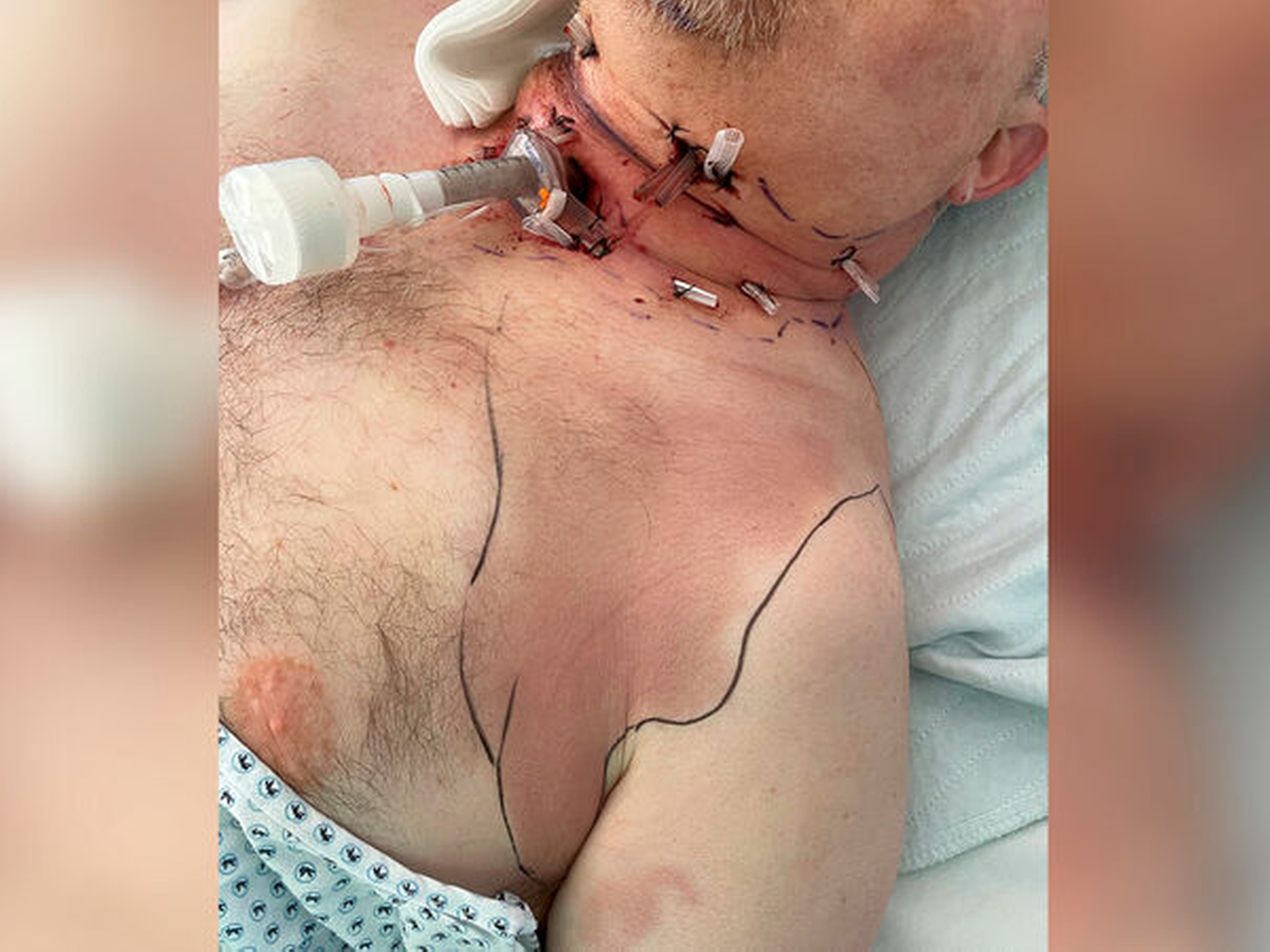 Bereits bei der anästhesiologischen Einleitung war das Airway-Management mit fiberoptischer Intubation erschwert. Daher erfolgte die intraoperative Entscheidung zur Tracheotomie des Patienten zwecks Atemwegssicherung. Postoperativ wurde der Patient bei einem beginnend septischen Krankheitsbild auf die Intensivstation übernommen. Die intraoperativ gewonnenen Wundabstriche zeigten neben Staphylokokken auch zahlreiche grampositive und -negative Anaerobier wie Prevotella buccae und Bifidobacterium dentium. Nach Rückübernahme auf die Normalstation erfolgte zunächst die intensivierte antibiotische Therapie mit Tazobactam und Imipenem, die in enger Absprache mit der mikrobiologischen Abteilung in domo nach Antibiogramm im Verlauf auf Ciprofloxacin und Metronidazol umgestellt wurde. Laborkontrollen der Infektionsparameter und der Elektrolyte wurden täglich durchgeführt. Postinterventionell zeigte der Patient Zeichen einer kardialen Dekompensation mit generalisierten Ödemen und verminderter Belastbarkeit. Eine Endokarditis konnte durch mehrere Vorstellungen in der kardiologischen Klinik der Universitätsmedizin jedoch ausgeschlossen werden. Ein erneutes Aufflammen der klinischen und der laborchemischen Infektionsparameter erforderte ein erneutes Eröffnen der zervikalen Logen und die Drainage von nekrotischen Gewebe (Abbildung 5). Unter täglichen Verbandswechseln und ausgedehnten Spülungen konnte der Patient vom Tracheostoma entwöhnt und sämtliche Drainagen konnten entfernt werden. Nach einem prolongierten Aufenthalt von vier Wochen wurde der Patient in die ambulante Nachsorge entlassen.