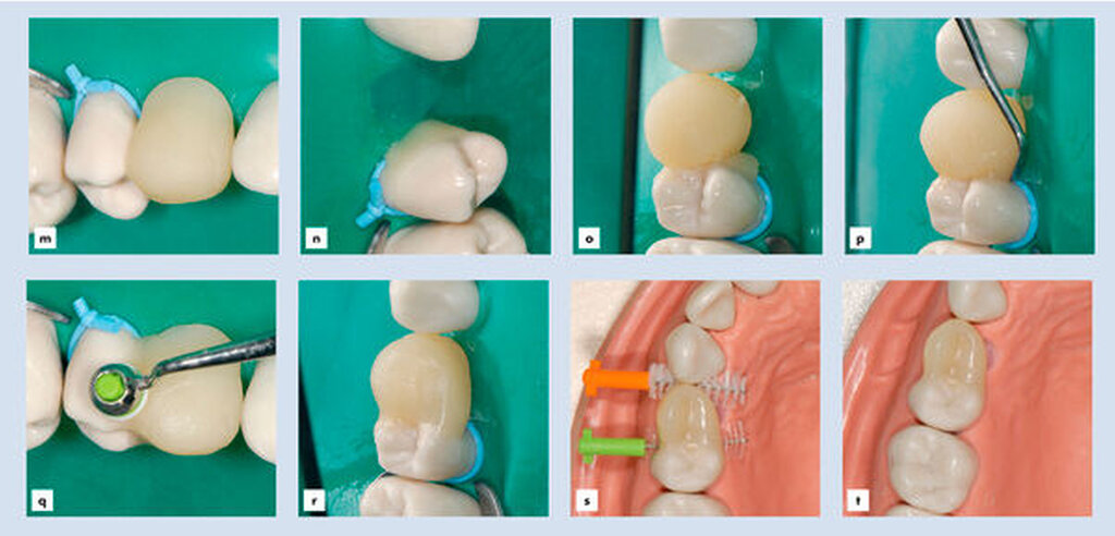 In den bisherigen Publikationen zu dieser Versorgungsart wurden die Arbeitsgänge zur Herstellung eines Zahnanhängers unter absoluter Trockenlegung (Kofferdam) präsentiert [Staehle, 2017, 2018, 2019a und c]. Eine Modifikation des technischen Vorgehens findet sich in Abbildung 2. Dabei wird der Anhänger zunächst unter relativer Trockenlegung geformt und gehärtet, um den Oberflächenstrukturen des Alveolarkamms im Bereich einer Zahnlücke optimal Rechnung tragen zu können. Erst zum Einkleben des Anhängers wird absolut trockengelegt. Abbildung 3 zeigt ein klinisches Beispiel für die Kategorie II nach 4¾ Jahren.