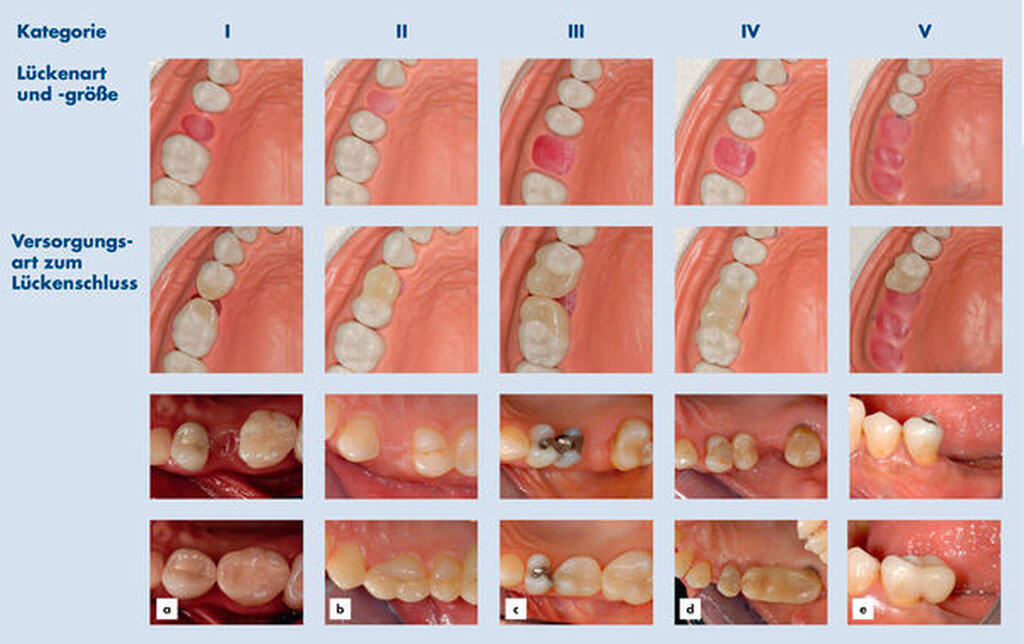 Falls eine Lücke nicht belassen werden kann und deshalb ein Lückenschluss beabsichtigt ist, kommen unter anderem kieferorthopädische, chirurgische, restaurative und/oder andere Maßnahmen in Betracht. Derzeit werden meist Implantate oder Brücken in ihren mannigfaltigen Variationen eingesetzt. Beide Optionen gehen meist mit einem mehr oder weniger hohen Grad an Invasivität einher. Substanzschonende Adhäsivbrücken werden (von Ausnahmen abgesehen) aktuell fast nur für den Frontzahnbereich empfohlen. Eine wenig invasive Therapieform insbesondere für den Seitenzahnbereich, die jederzeit die Rückkehr zur Ausgangssituation erlaubt, ist die Gestaltung von Zahnverbreiterungen und Zahnanhängern. Dabei werden Zahnlücken mittels direkt eingebrachtem, adhäsiv verankertem Komposit geschlossen. Die konkrete Ausführung kann in folgende Kategorien unterteilt werden (Abbildung 1):