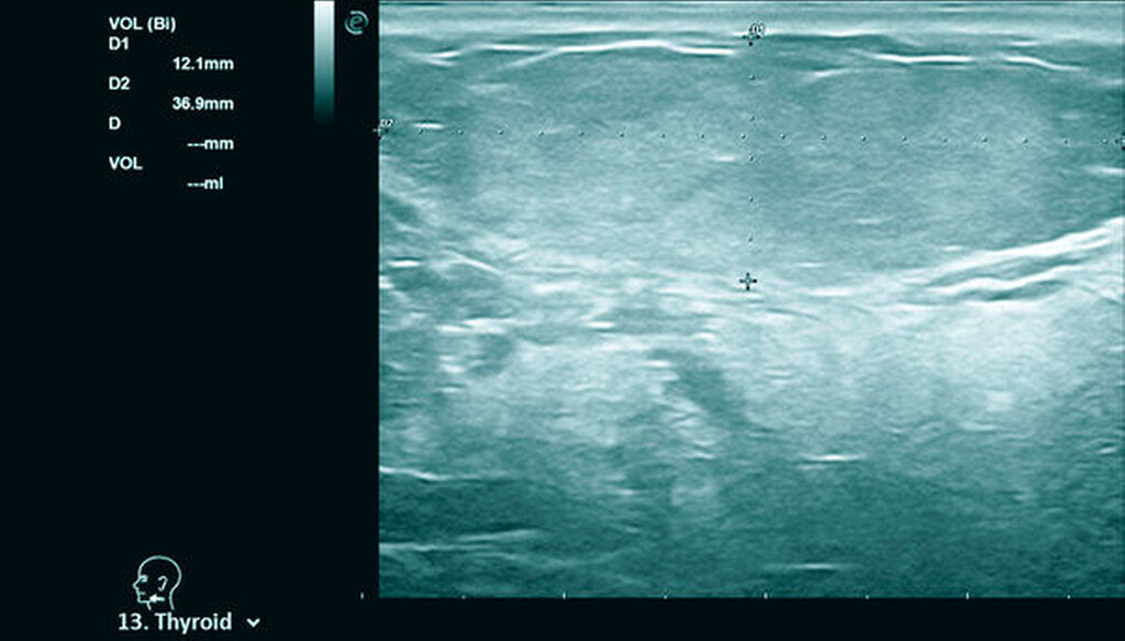 Palpatorisch präsentierte sich ein prall-kugeliger Tumor, der zum umliegenden Gewebe gut verschieblich war. Die bildgebende Diagnostik mittels B-Mode-Sonografie zeigte eine echoreiche, scharf begrenzte Raumforderung mit dorsaler Schallverstärkung (Abbildung 2). Aus der Zusammenschau aus klinischem und sonografischem Bild wurde der Verdacht auf ein Lipom gestellt. Die alio loco angefertigte MRT bekräftigte diese Verdachtsdiagnose, zudem zeigte sich darin die Unterbrechung des Platysma durch das verdrängende Wachstum des Befunds in die Tiefe (Abbildung 3).