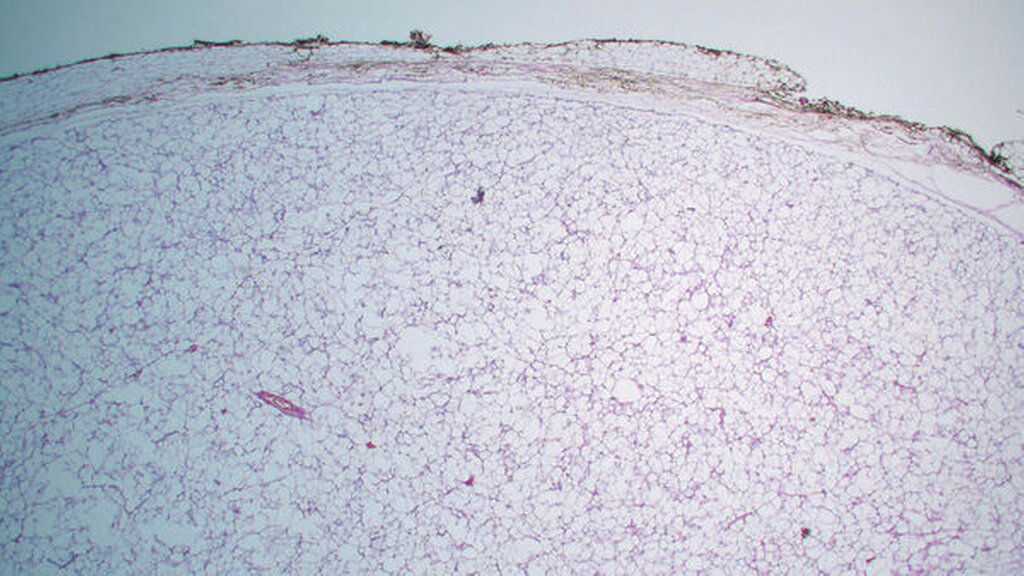 Intraoperativ wurde der Befund über einen submandibulären Schnitt unter Darstellung und Schonung des Nervus facialis in toto entfernt (Abbildungen 4 bis 6). In der histologischen Aufbereitung zeigte sich ein Hibernom mit zahlreichen großen uni- sowie plurivakuolären, lipidreichen Zellen (Abbildung 7). Bei einer Nachsorgezeit von nunmehr einem Jahr zeigte sich kein Anhalt auf das Vorliegen eines Rezidivs.