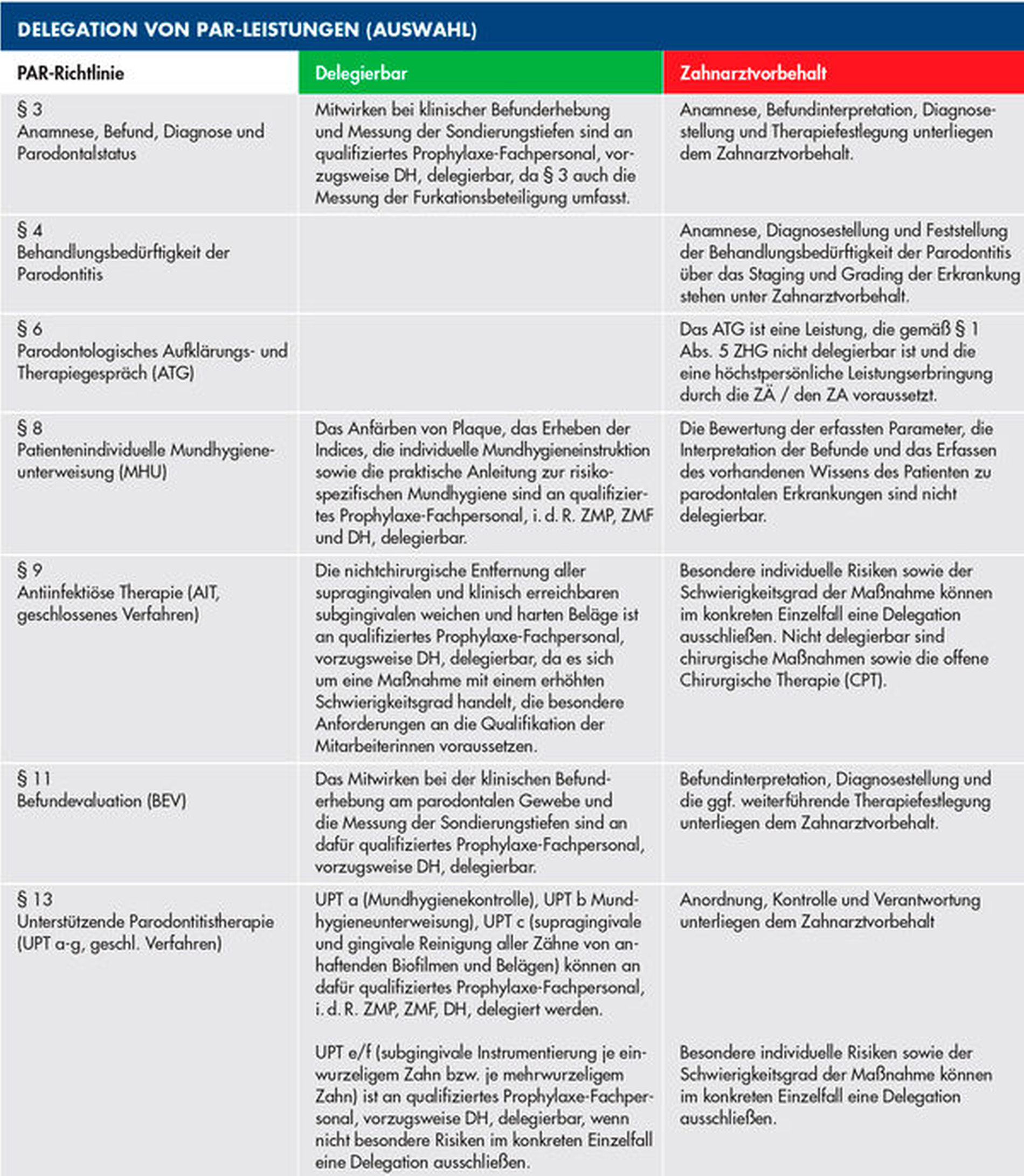 Ganz grundsätzlich ist festzustellen, dass die neue PAR-Richtlinie sowie die entsprechenden BEMA-Ziffern vertragszahnärztliche Leistungen regeln. Berufsrechtlich hat sich durch die Aufnahme der PAR-Behandlungsstrecke in den BEMA nichts geändert. Also auch unter den Bedingungen der neuen PAR-Richtlinie gibt es delegierbare (Teil-)Tätigkeiten. Vereinfacht kann man wohl formulieren: Was vorher (unter den Bedingungen der bisherigen Bestimmungen) delegierbar war, ist auch unter den Bedingungen der neuen PAR-Richtlinie delegierbar.