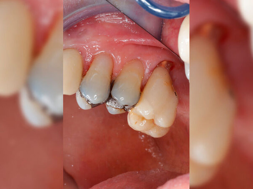 Ein 59-jähriger Patient stellte sich erstmals 2015 mit rezidivierenden pochenden Beschwerden und zeitweise zusätzlich auftretendem Pusaustritt an Zahn 16 vor. Klinisch zeigte sich ein ausgeprägter Attachmentverlust distal mit bis apikal sondierbarer distobukkaler Wurzel, Furkationsbeteiligung und Pusaustritt sowohl über den Parodontalspalt als auch durch einen distobukkal gelegenen Fistelausgang. Zunächst erfolgte die endodontische Behandlung des Zahnes 16 mit anschließender systematischer PA-Therapie. Bei persistierender parodontaler Problematik an 16 wurde die Möglichkeit der Teilamputation der distobukkalen Wurzel mit dem Patienten diskutiert, um die Hygienefähigkeit und damit die Prognose des Zahnes zu verbessern. Auch über die Extraktion als Alternative wurde der Patient aufgeklärt. Er war allerdings motiviert, seinen Zahn so lange wie möglich zu erhalten.