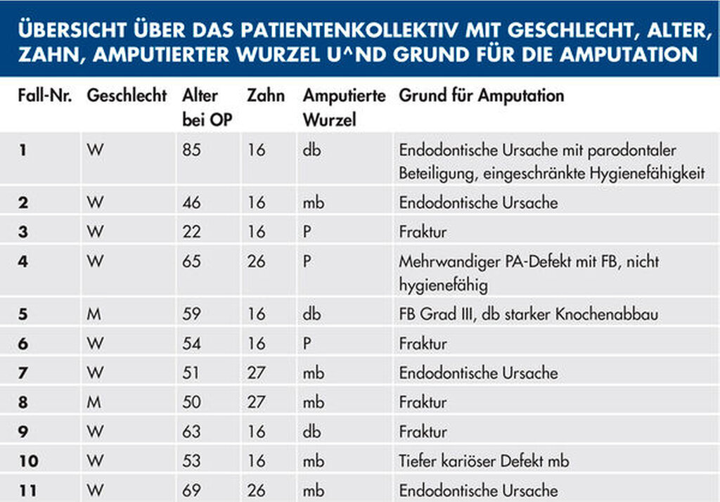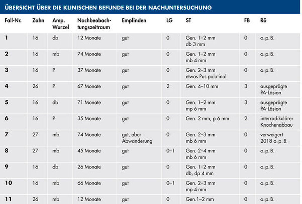 Tabelle 1 (links) zeigt eine Zusammenstellung der in unserer Praxis behandelten elf Patientenfälle mit einer durchschnittlichen klinischen Nachbeobachtungszeit von 47,2 Monaten. Behandelt wurden die ersten und die zweiten oberen Molaren. Das Durchschnittsalter der Patienten lag bei 52 Jahren. Die Nummerierung der folgenden Fallbeispiele entspricht der in der Tabelle.