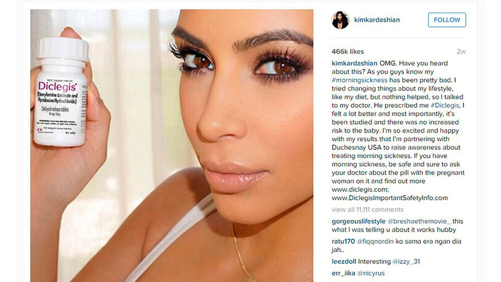 Wahrscheinlich begann alles 2015 mit einem InstagramPost der US-amerikanischen Influencerin Kim Kardashian. „OMG. Habt ihr davon gehört?“, schrieb das damals schwangere Model an ihre seinerzeit 34 Millionen Instagram-Follower und lobte das Präparat Diclegis, weil es ihr angeblich so gut bei ihrer Morgenübelkeit geholfen habe. „Es wurde untersucht und es gibt kein erhöhtes Risiko für das Baby“, schrieb sie neben einem Selfie, auf dem sie das Präparat in die Kamera hielt. Sie sei so glücklich über die Wirkung, dass sie – gemeinsam mit dem Pharmahersteller Duchesnay – Aufmerksamkeit auf das Problem und seine mögliche Lösung lenken wolle.