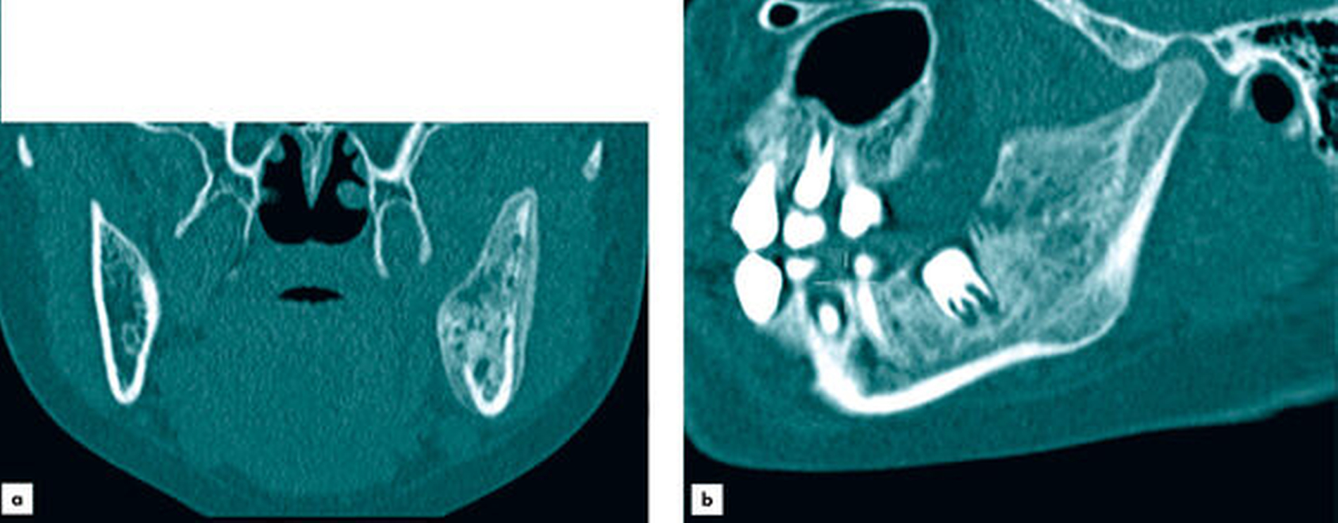 Eine zehnjährige Patientin stellte sich mit einer seit einigen Monaten bestehenden Schwellung der linken Wange bei ihrem Kinderzahnarzt vor. Allgemeinanamnestisch bestanden keine Vorerkrankungen. Die klinische Untersuchung zeigte neben einer leicht verminderten Mundöffnung ein regelhaftes Wechselgebiss mit physiologischen Zahndurchbrüchen und altersgerechter Zahnentwicklung. Die Seitenzähne im betroffenen dritten Quadranten wiesen keine Perkussionsempfindlichkeiten auf, Vitalitätsproben an den Zähnen 43, 75 und 46 zeigten sich positiv. Abgesehen von einer knochenharten, nicht druckdolenten Auftreibung der linken Mandibula und einer daraus resultierenden moderaten, asymmetrischen Gesichtsschwellung existierten keine klinisch apparenten Beschwerden. Zur weiteren Diagnostik und Therapie wurde die Patientin daraufhin an die Klinik und Poliklinik für Mund-, Kiefer- und Gesichtschirurgie der Universitätsmedizin Mainz überwiesen.