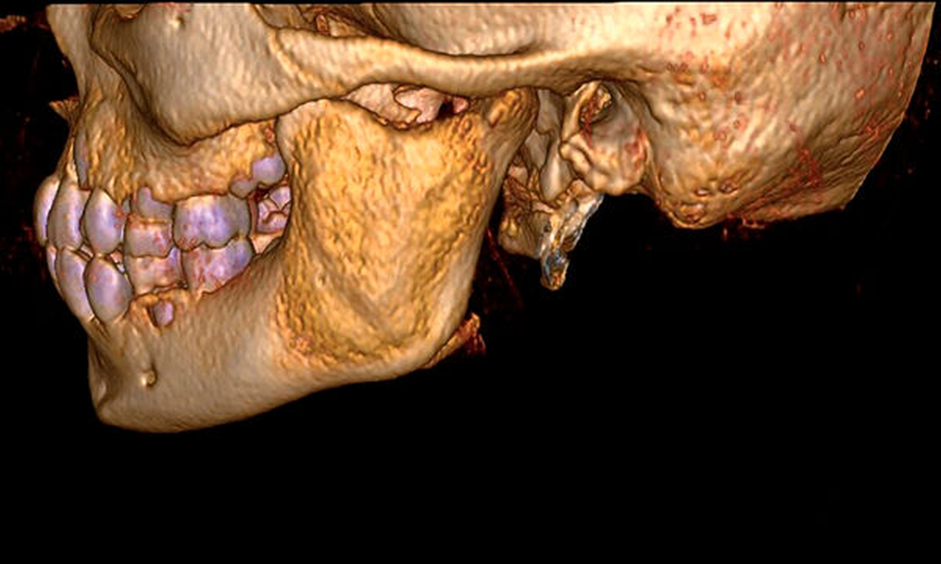 Zur (differenzial-)diagnostischen Beurteilung und Darstellung der Befundausdehnung wurde zunächst unter Berücksichtigung des Kindesalters eine Bildgebung mittels Magnetresonanztomografie (MRT) durchgeführt. Diese zeigte in der T1-Wichtung im Bereich des linken Kieferwinkels lokalisierte diffuse, inhomogene und signalarme Strukturen mit expansiver Auftreibung der Kortikalis und entzündlicher Begleitreaktion der angrenzenden Muskulatur (Abbildung 1). Aufgrund der MRT-morphologisch nicht zweifelsfrei wegweisenden Befunde erfolgte zur genaueren Beurteilung des knöchernen Gesichtsschädels eine ergänzende Computertomografie (CT), die kongruent zu den signalarmen Bereichen in der MRT milchglasartige Volumenvermehrungen des linken Kieferwinkels mit Ausbreitung in den Processus coronoideus und ins angrenzende Collum mandibulae aufwies (Abbildung 2). Die durchgeführte CT stützte bei den oben genannten, charakteristischen Kriterien (Abbildung 3) im Kontext der klinischen Befunde die Arbeitsdiagnose der fibrösen Dysplasie.