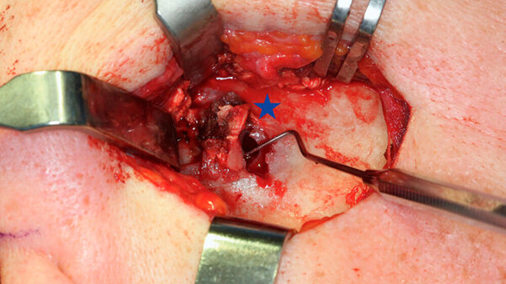 Im Jahr 2009 wurde eine 45-jährige Frau zur Mitbeurteilung an die Abteilung für Mund-, Kiefer- und plastische Gesichtschirurgie des Universitätsklinikums Bonn überwiesen. Im Orthopantomogramm (OPG) war durch den Hauszahnarzt bei der Patientin als Zufallsbefund eine Aufhellung im Bereich des gesamten rechten Kondylus festgestellt worden. Die daraufhin durchgeführte Inzisionsbiopsie erbrachte einen unspezifischen Befund ohne Hinweis auf Malignität. Wir empfahlen daher zunächst eine konservative Behandlung mit regelmäßigen radiologischen Nachuntersuchungen.