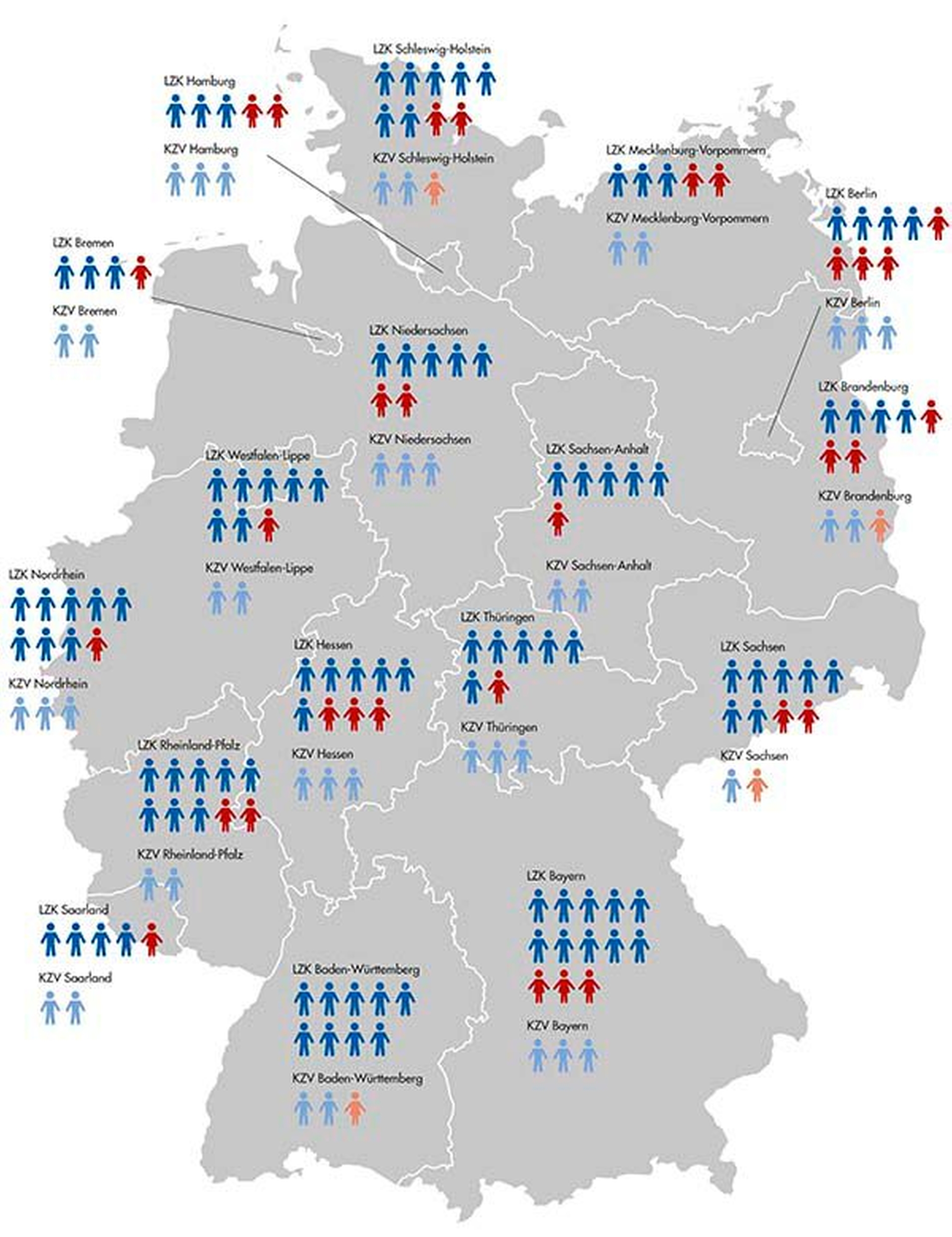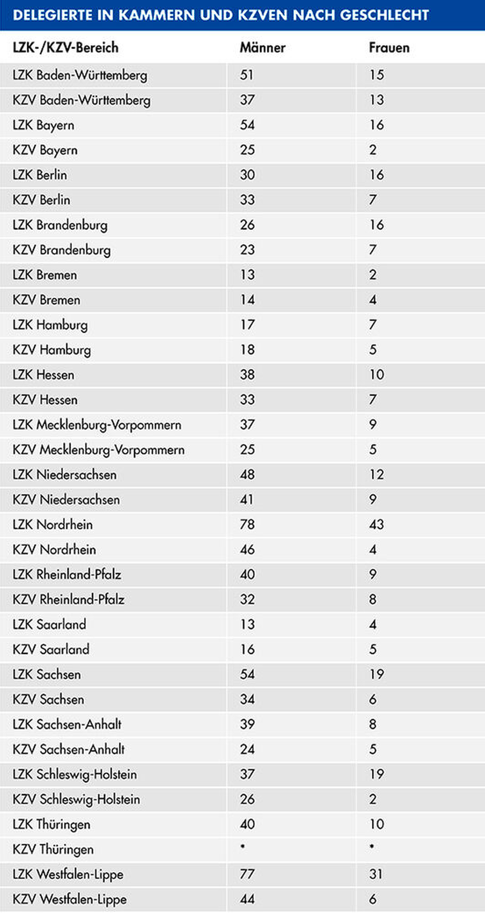 Insgesamt 15.575 Studierende waren im Wintersemester in Deutschland im Fach Zahnmedizin eingeschrieben, davon rund zwei Drittel weiblich. Karriere machen trotzdem weiterhin vor allem die Männer. Das ist in der Wissenschaft so, das ist in der Standespolitik nicht anders: Sind die Frauen in den Vertreterversammlungen von Kammern und KZVen wenigstens noch halbwegs vorhanden, sind sie in den Vorständen nahezu unsichtbar, wie unsere Recherche zeigt.
